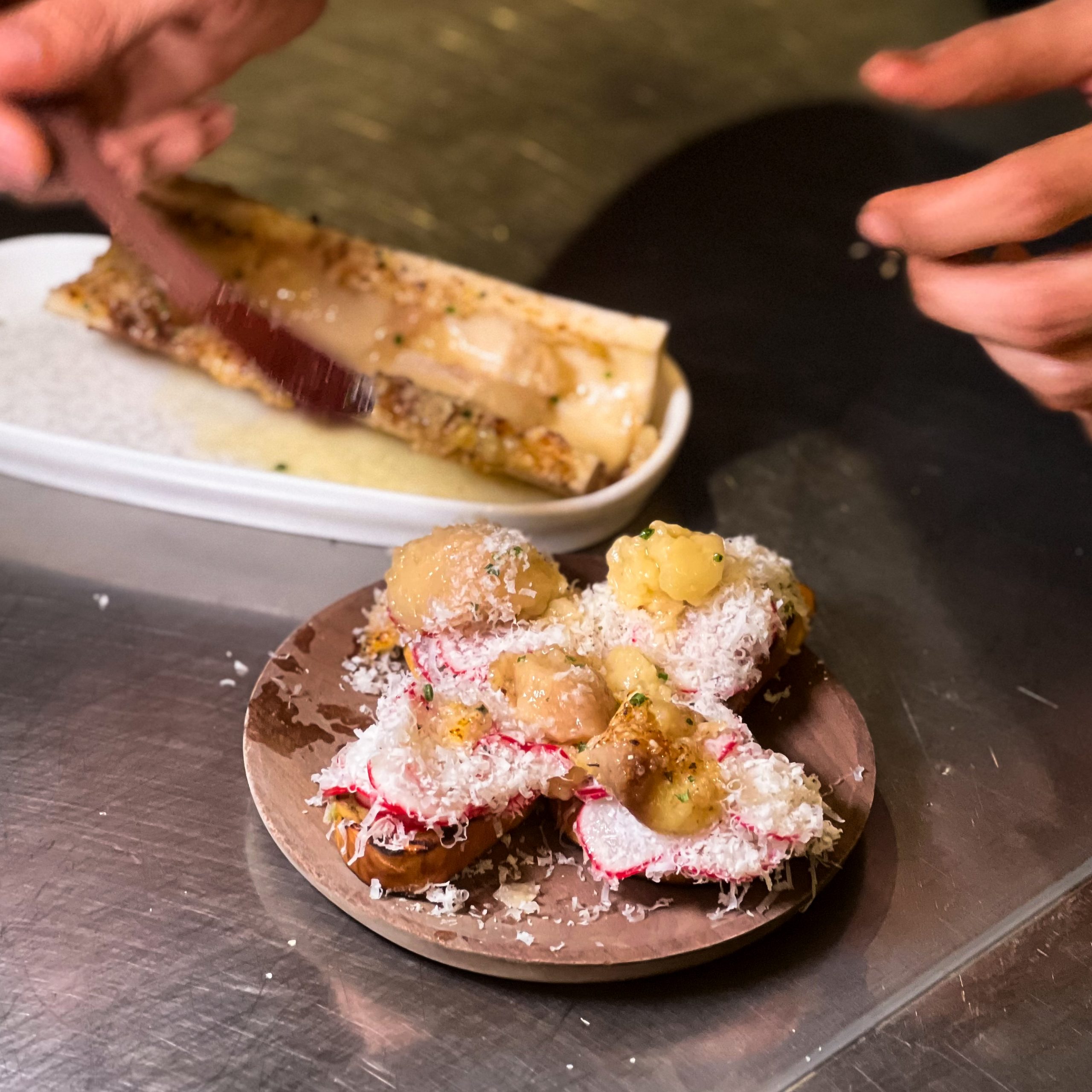 You are supposed to scoop up the creamy bone marrow and savour it with radish and salsa verde crostini. Airy parmesan shavings take it to a whole new level, making for more than a couple of perfect bites.