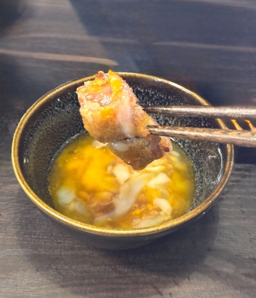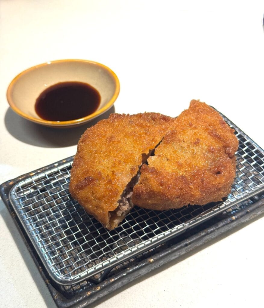 The Menchikatsu is a breaded Hamburg made up of ground A5 and Australian Wagyu. You might think that such a deep-fried dish would taste tough and dry, but the succulence of the meat would prove you otherwise.