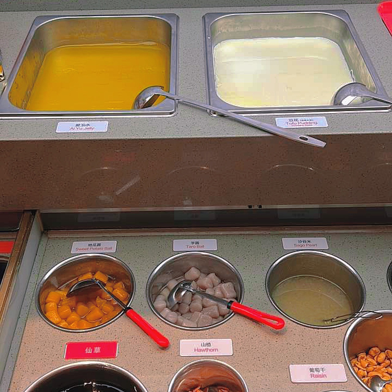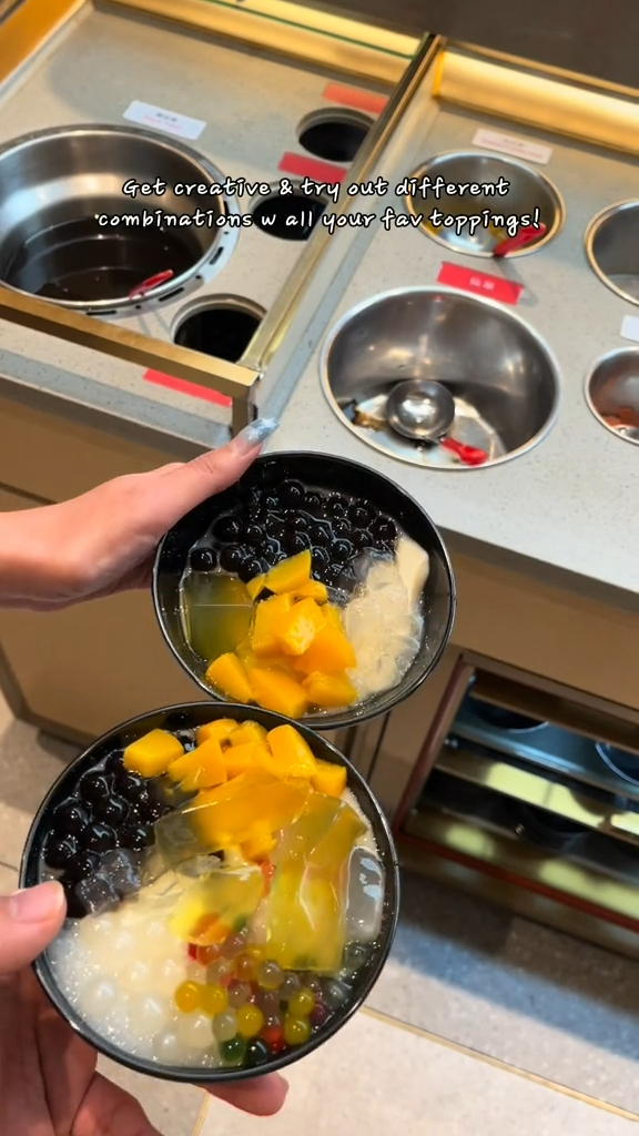 The dessert bar is equipped with an shaved ice machine, along with over 20 toppings to choose from, like taro balls, sweet potato balls, black pearls, sago pearls, hawthorn, red beans, rainbow QQ balls, coconut jelly, and of course, plenty of fresh fruit to go around.