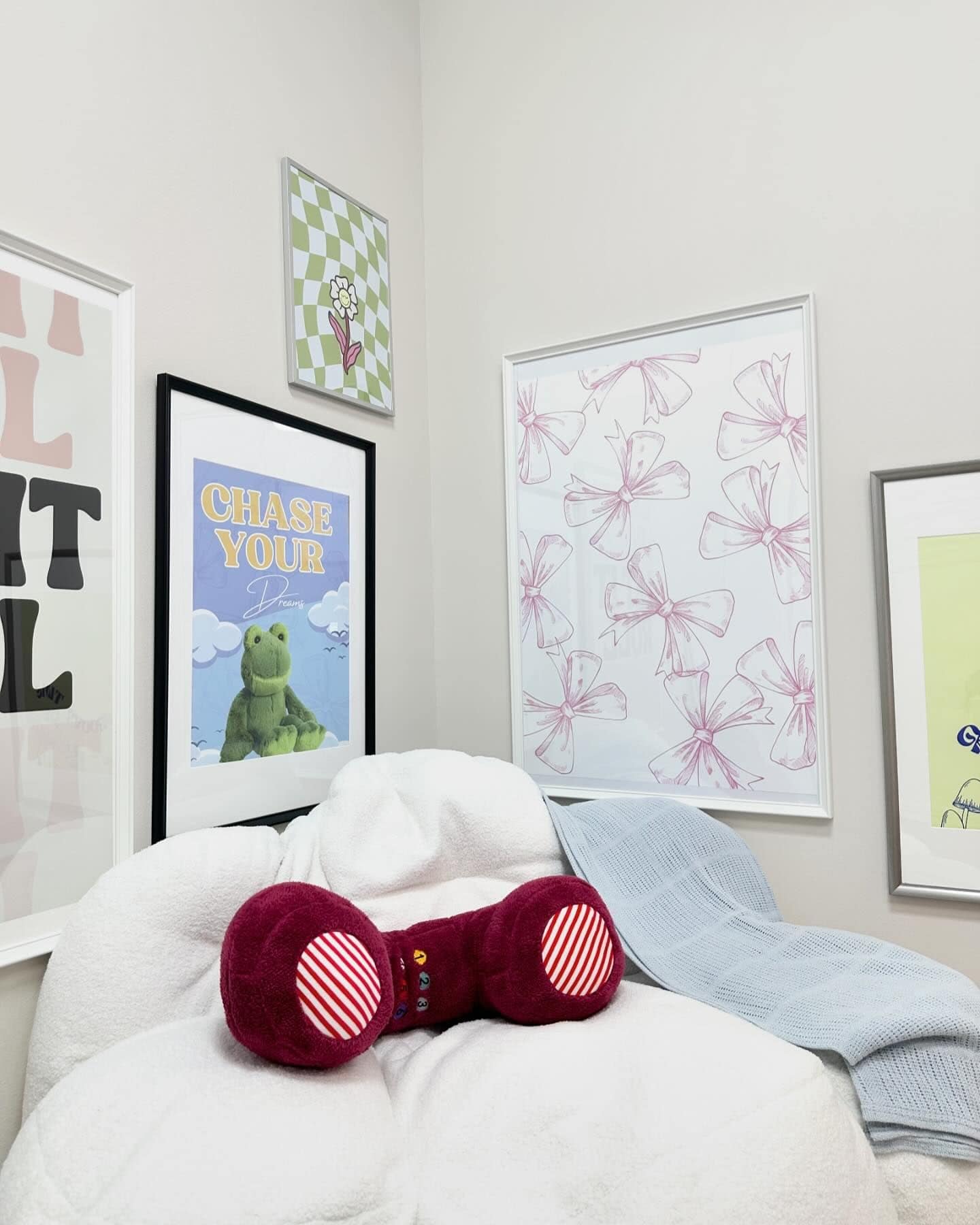The room is decorated with artsy posters on the walls, with one featuring a bunch of pink ribbons (coquette, anyone?), and a green chequered rug that adds a pop of colour and texture to your top-down photos (hence its name).