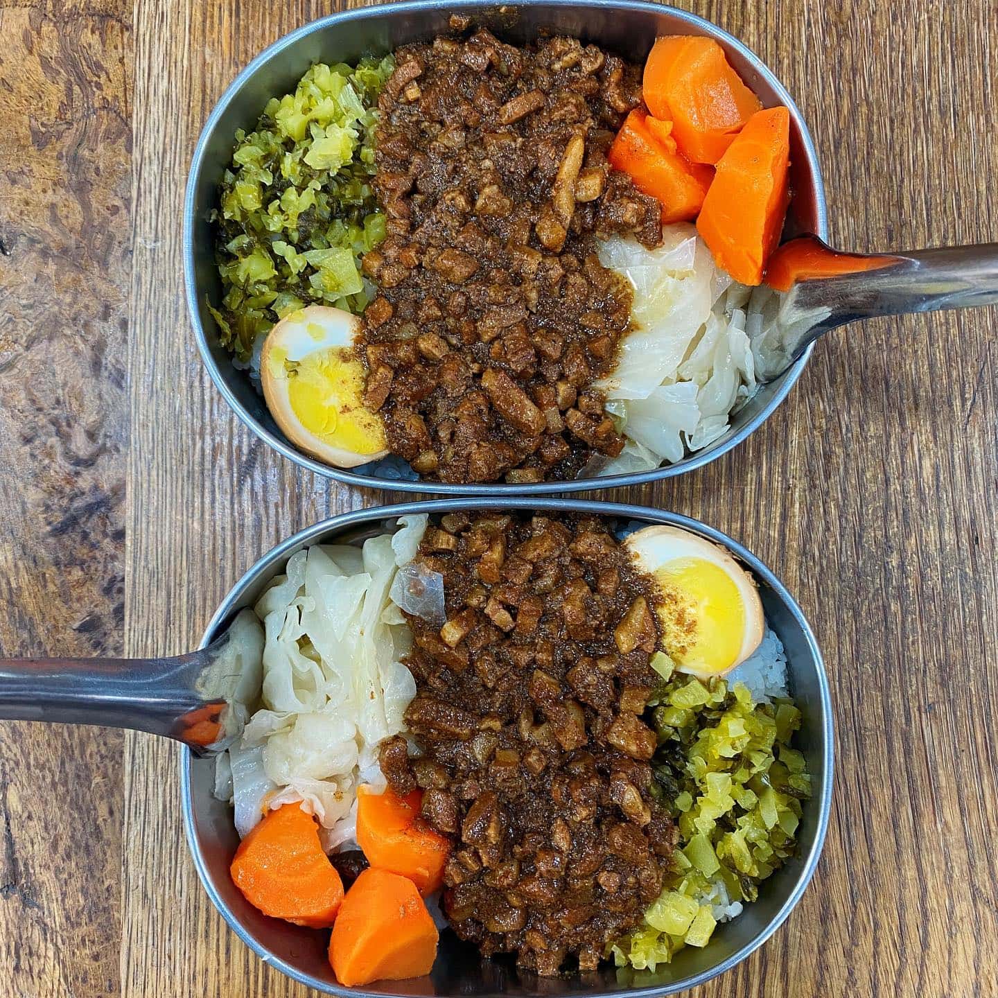 All bento boxes come with carrot, cabbage, shiitake mushroom, pickled mustard greens, and a braised egg, making for a wholesome and filling meal.