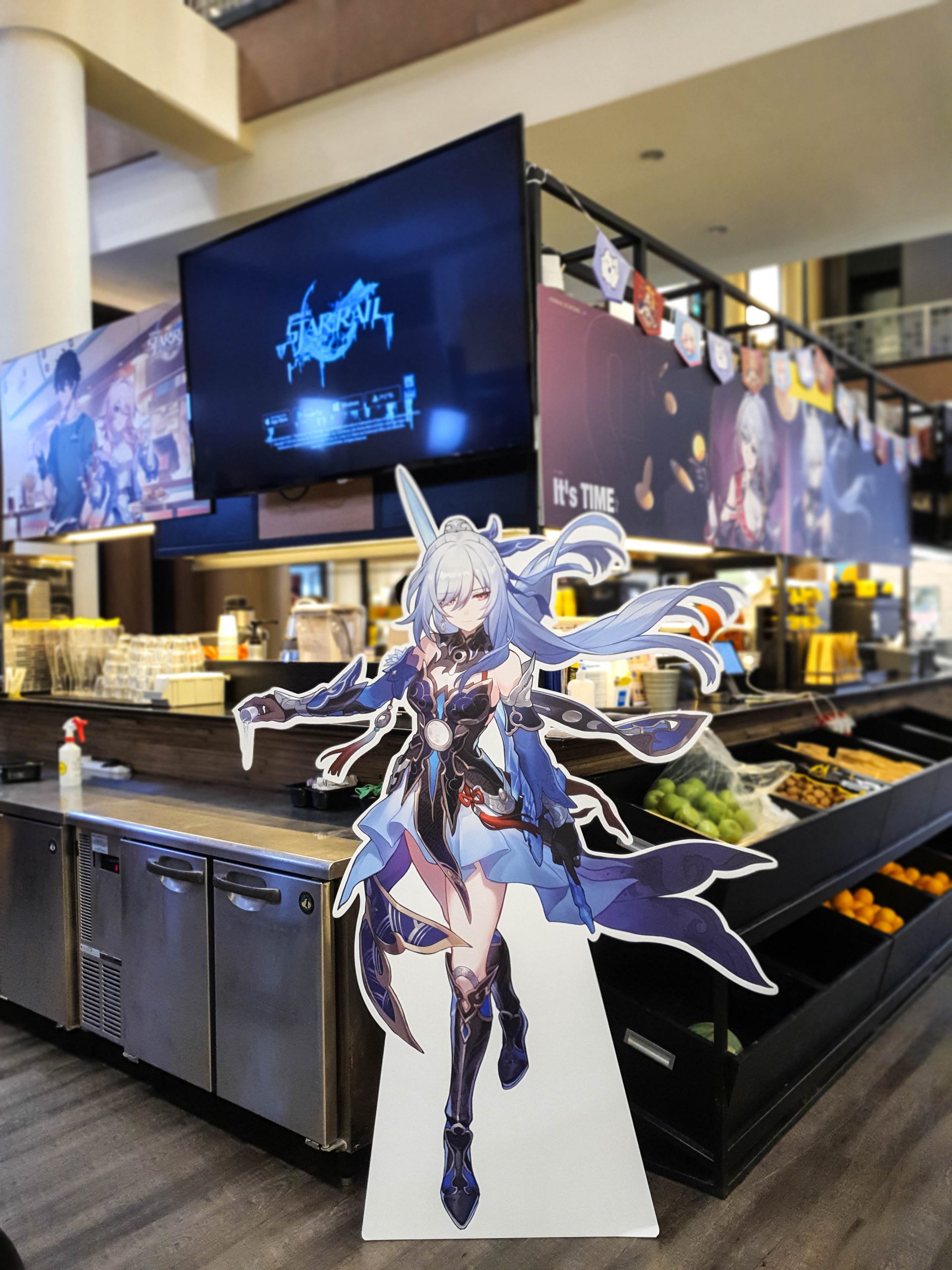 Upon arriving at the cafe, you’ll spot life-size standees of March 7th, Dan Heng • Imbibitor Lunae and other characters that will tempt you to take them home. Splashed across the walls and tables are artworks of the poster children, and you’ll find the merchandise booth further in with shelves of character merch like acrylic stands, metal badges and more.