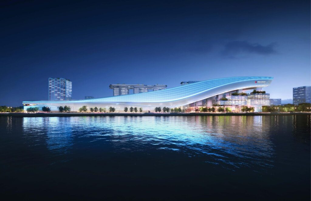 The sleek cyberpunk aesthetic with expansive LED screens wrapped around the facade of the building illuminates the striking and unique architectural concept of Huafu Ice and Snow World.