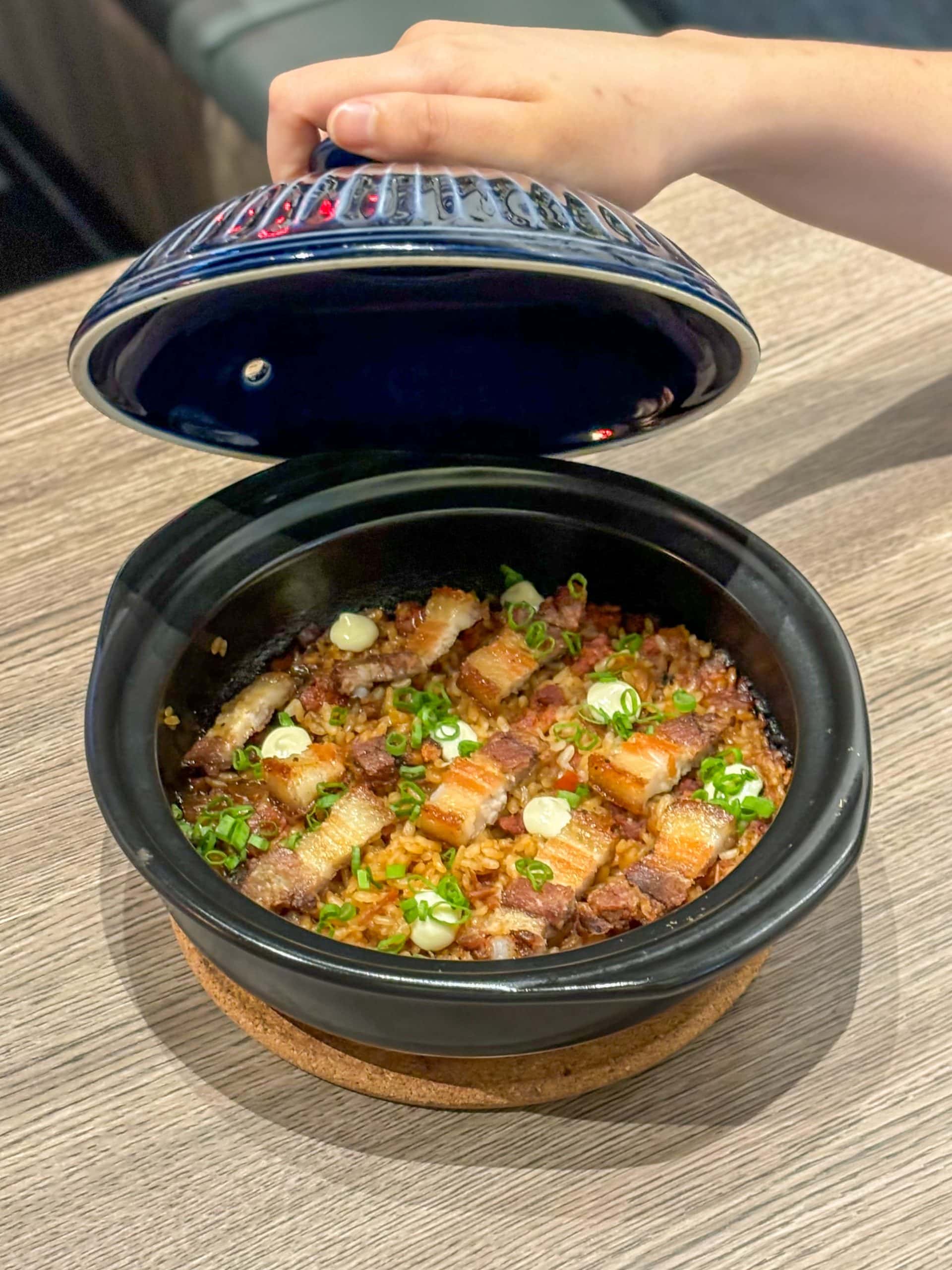 This dish is comfort in a pot, with steaming hot rice topped with crispy pork belly, served in a traditional Japanese earthenware pot (donabe).