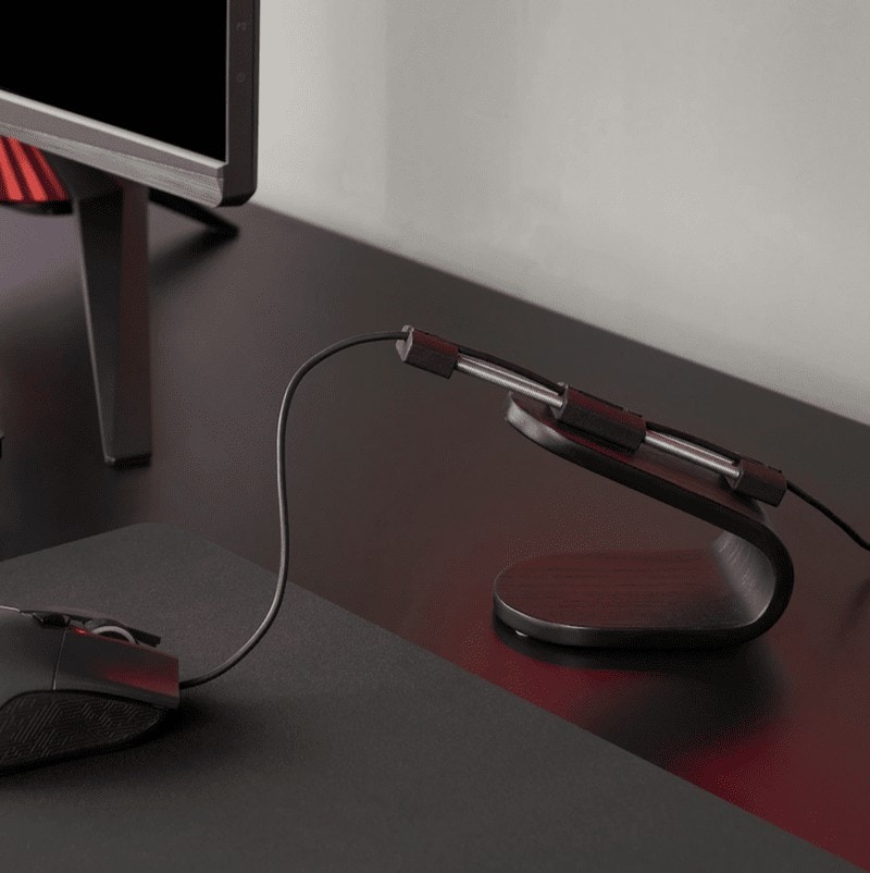 The holder can be clamped firmly to the table, and is kept at a safe distance away from the keyboard.