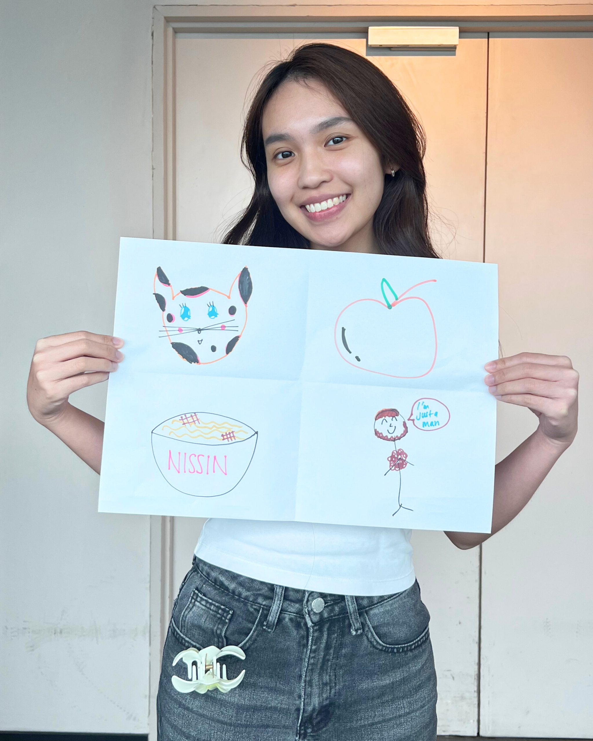 Wing Xin gave a valiant effort but seems to have had to resort to words because her drawings couldn’t make it. The apples look a little cherry-like, and Ash’s hair looks a little sparse. However, we do love the little kitty perched on a scenic landscape.