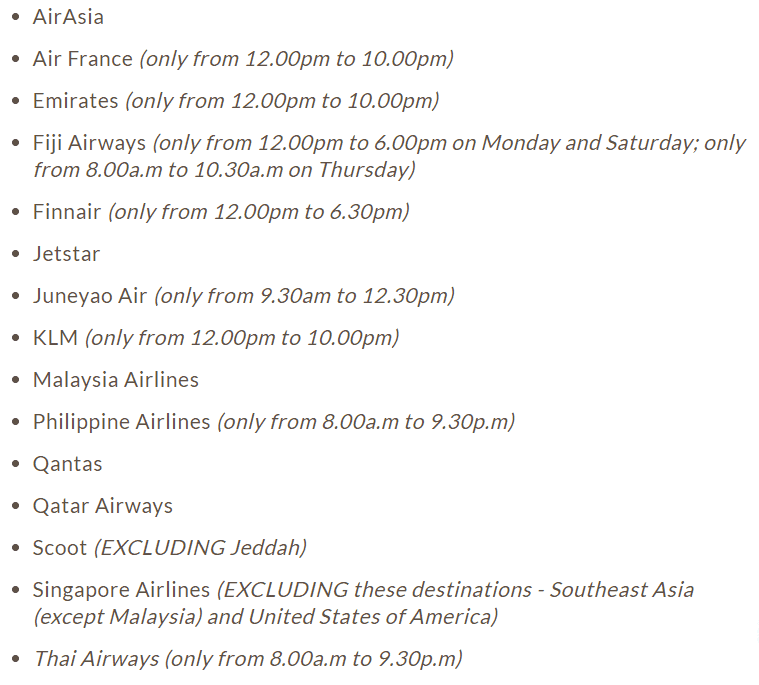 The early check-in counter is open daily from 8am to 12am, but you’ll need to be flying with the following airlines: