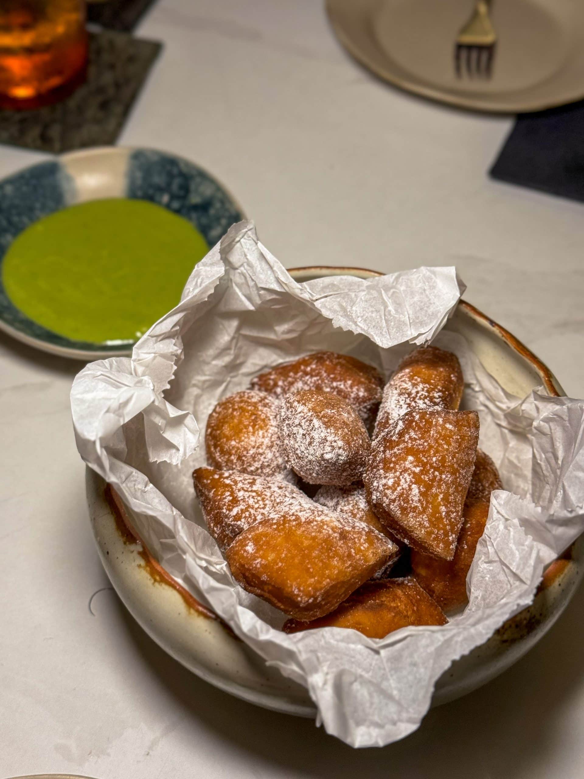 At the time of writing, there is only one dessert available — a moist and fluffy Grilled Banana Cake (S$14) with coconut ice cream served on a banana leaf, drizzled with gula melaka caramel — but you can definitely look forward to more, like these delightful beignet-style donuts with a pandan dip.