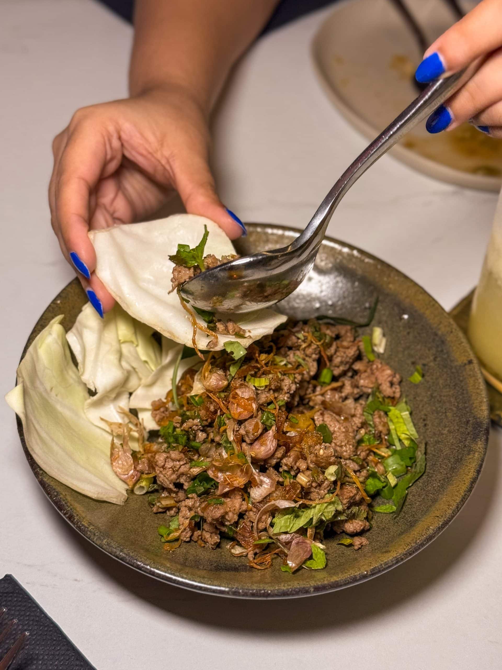 For something more unique, the Northern Duck Laab (S$20) stars salty, savoury minced duck flavoured with a blend of aromatic herbs and spices. You’re meant to enjoy it with crunchy cabbage for a fun textural contrast, and so we did.