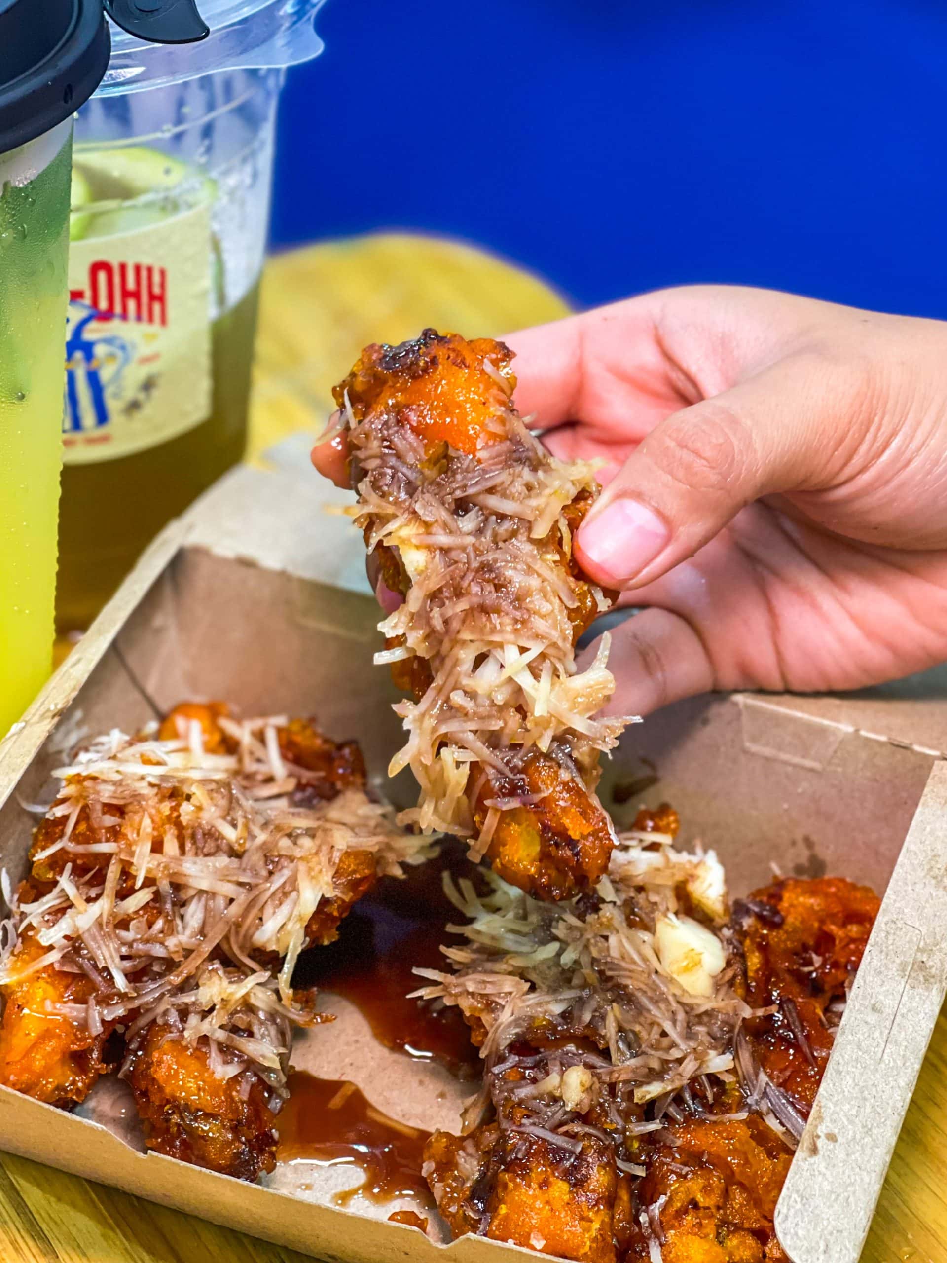 If you’re one of those that can’t handle spice, then the Truffle Mac & Cheese Smokey Fries (S$11.90) is definitely the one to get. It is drenched in nacho cheese sauce topped with macaroni and popcorn chicken. It’s aromatic, super cheesy, and makes for the perfect bazaar food.