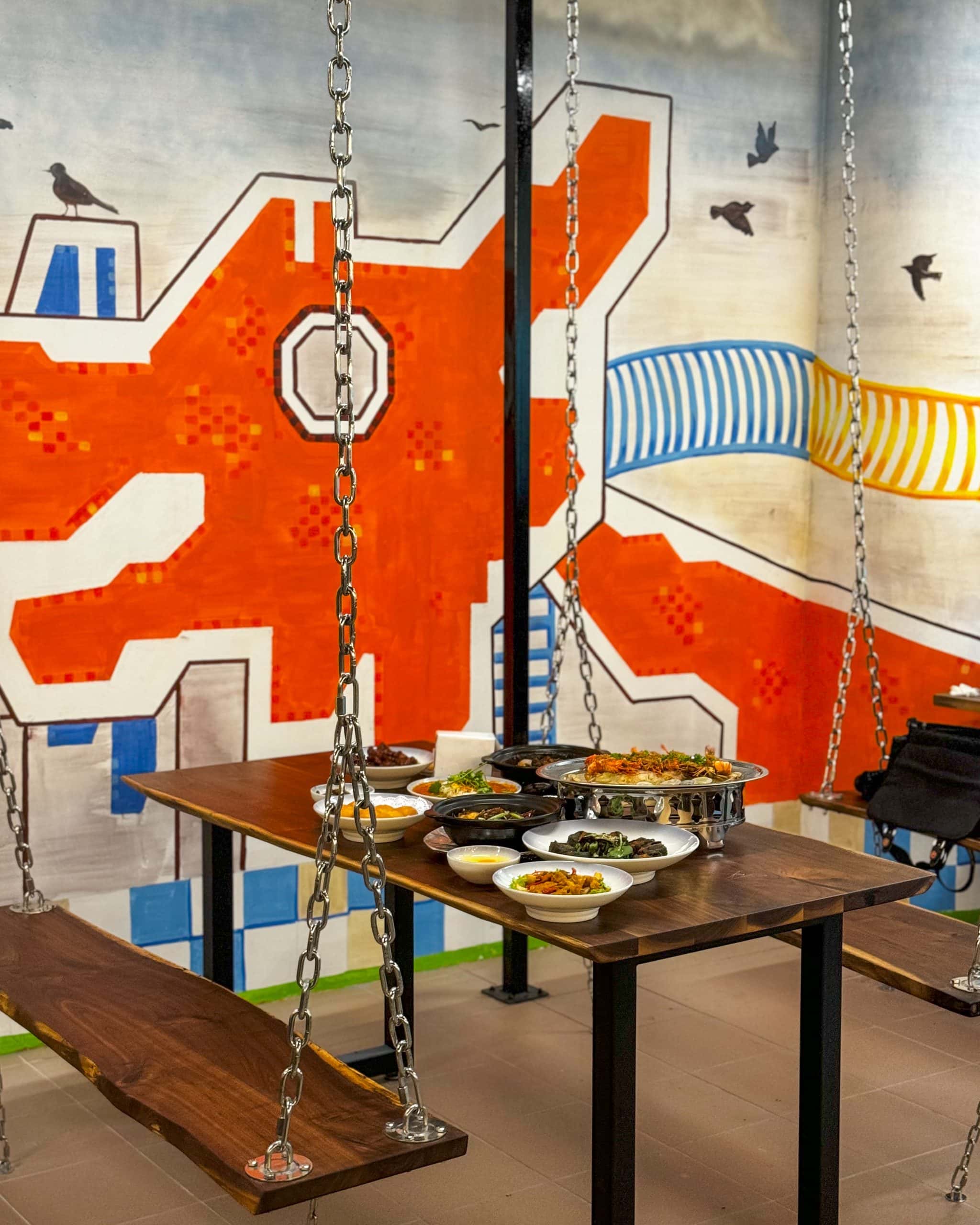 The walls are lined with vibrant murals depicting scenes of children playing at the Dragon Playground, as well as the Peranakan shophouses, evoking nostalgia in diners.