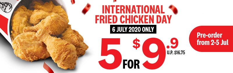KFC will be celebrating our love for fried chicken with a $9.90 promotion for their 5 pc chicken bucket (U.P. $16.75) on International Fried Chicken Day! Enjoy the chicken bucket with artistes and fellow Singaporeans on 6 July, 7.30pm to 8.30pm, during their virtual eat-together event.