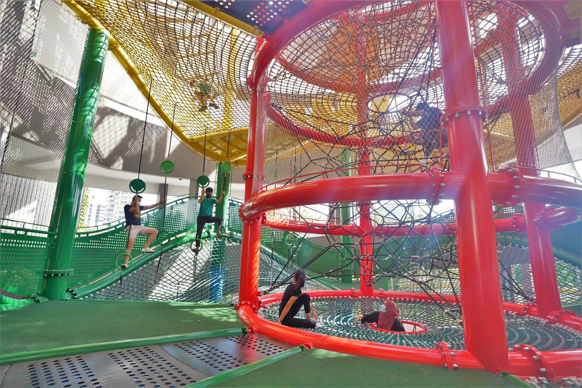Slide, scale, or hop around structures resembling fruits and trees, including a giant Cempedak Play Area and Saga tree “pods”. The 5.8-metre tall Banyan Tree Tower features “roots” and “branches” that extend across the area, filled with obstacle courses like climbing ropes, swings, and tube slides for the adventurous.