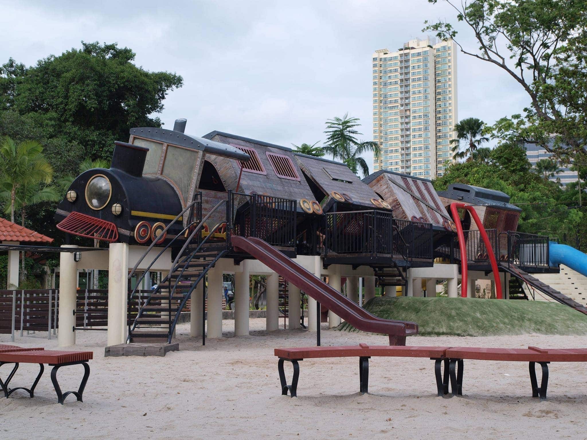 If you’re looking for an IG-worthy playground, Tiong Bahru Park is where it’s at. This haven for fans of Thomas the Tank Engine is equipped with a tilting train, flying fox, mini-maze, swings, and a sandpit for sensory play. The quirky tilting train is, of course, the centrepiece. Kids can climb aboard and navigate the locomotive’s carriages with multiple entry points, ramps, and tube slides, making for a topsy-turvy experience unlike any other.