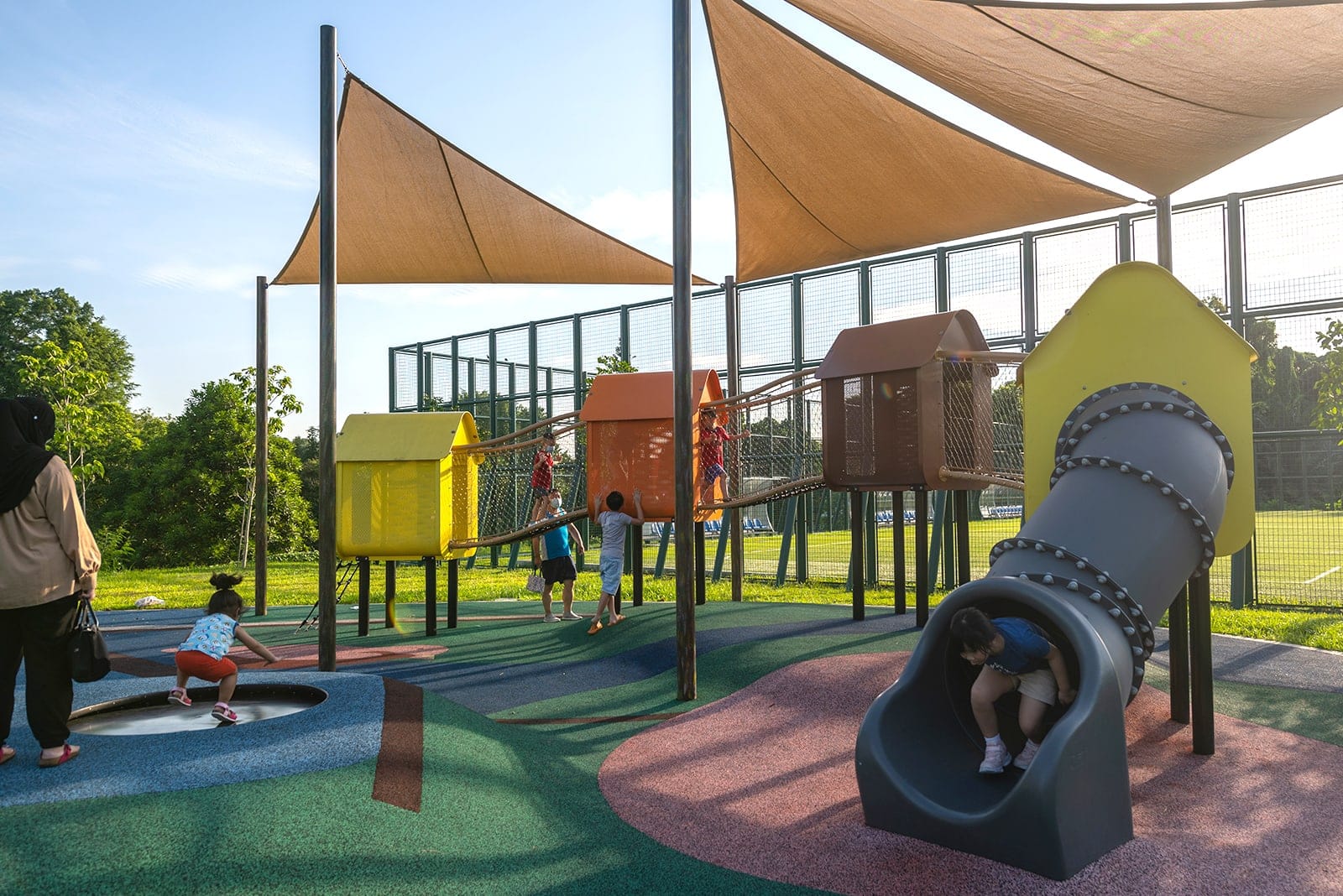 A visually arresting sight awaits at the Treehouse Playground at Yishun N8 Park — colourful treehouses on stilts. There are several playhouse sets of varying height, connected by net bridges and slides on a natural landform. Other play features include built-in trampolines, tunnels, and “hammock” swings to chill at.