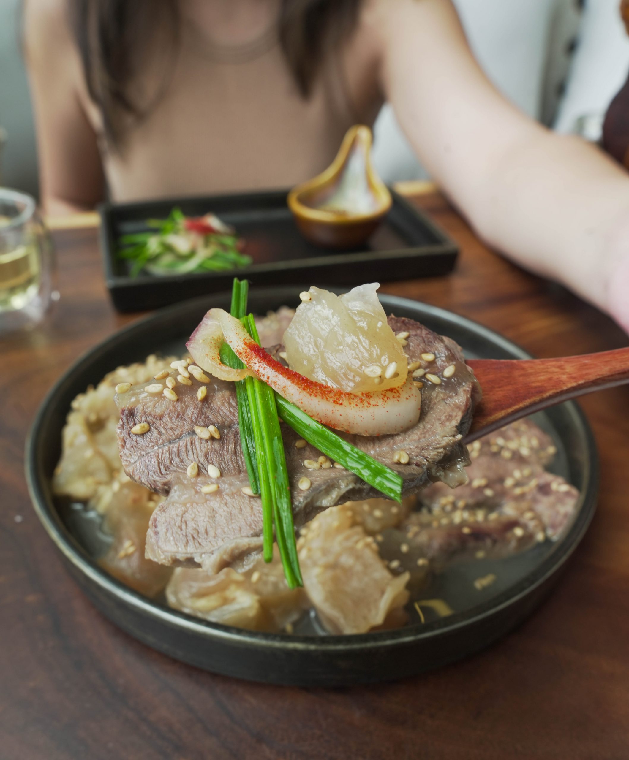 For mains, we had the Arongsatae & Dogani (S$40) which is a beef heel muscle and tendon that has been braised for over six hours, drenched in a collagen broth and served with a tangy yuja chives salad on the side. The beef was tender and juicy, while the yuja salad gave a tangy and refreshing crunch. Definitely a must-have when you visit.