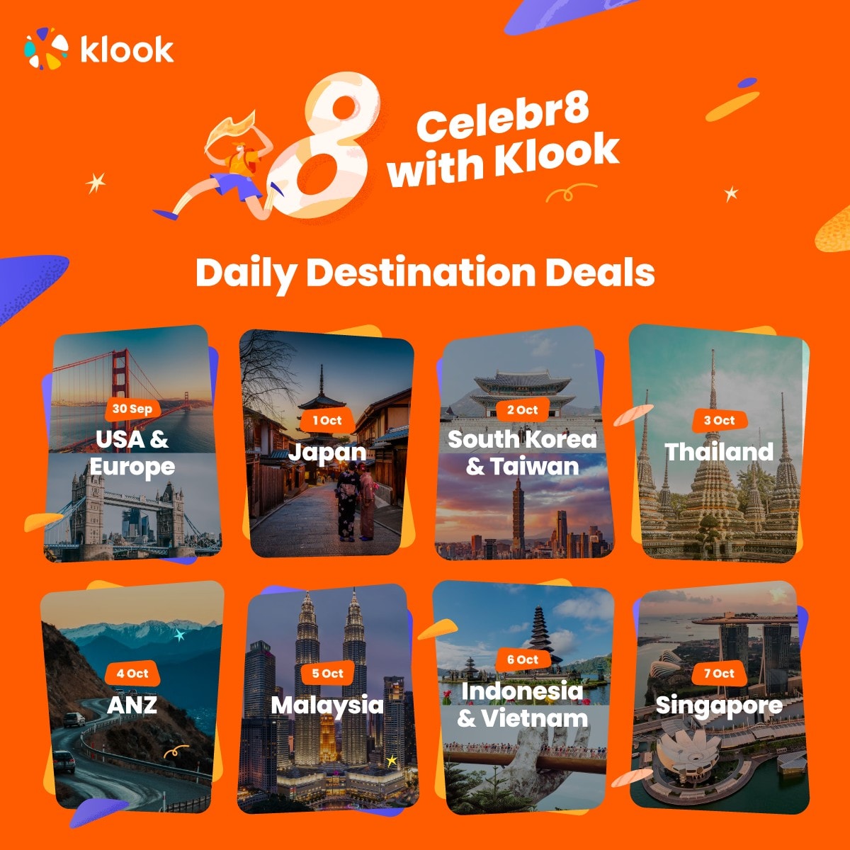 Here’s all you need to do – simply join the party and celebrate Klook’s 8th birthday with fun events like 8 Days of Daily Destination Deals, Daily Spin the Wheel and Klook Coin Chase. The virtual birthday celebrations will run from 30 September to 14 October 2022 and here’s all you need to know.