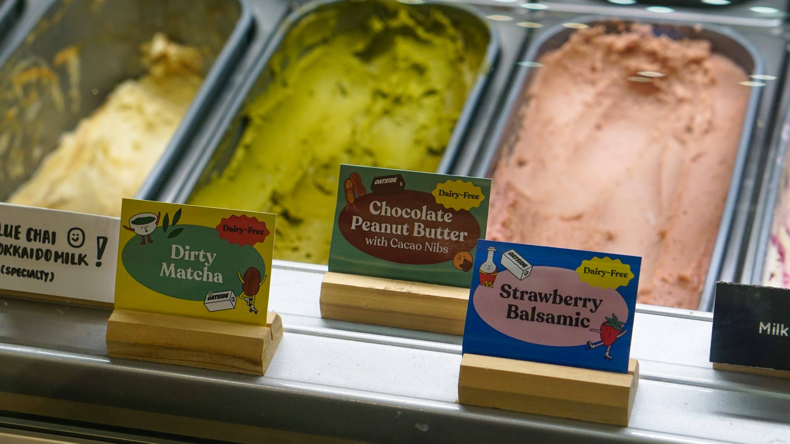 We also spotted three new plant-based, dairy-free flavours produced in collaboration with oat milk brand Oatside — Strawberry Balsamic, Chocolate Peanut Butter with Cacao Nibs, and the one I had my eye on from the get-go, Dirty Matcha (my favourite beverage but in ice cream form).