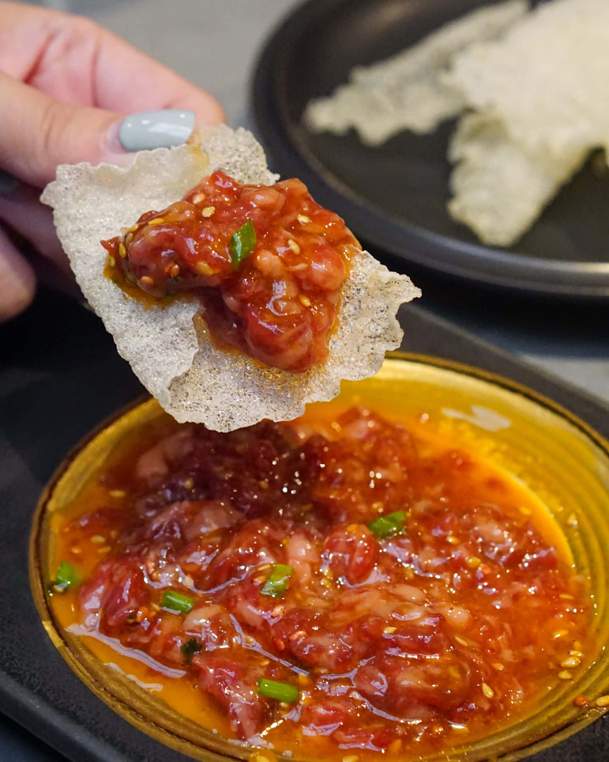 You’re supposed to mix everything together and enjoy the tartare, which was rich in flavour, if not a little slimy in texture (due to the size of the yolk), with crispy rice crackers.
