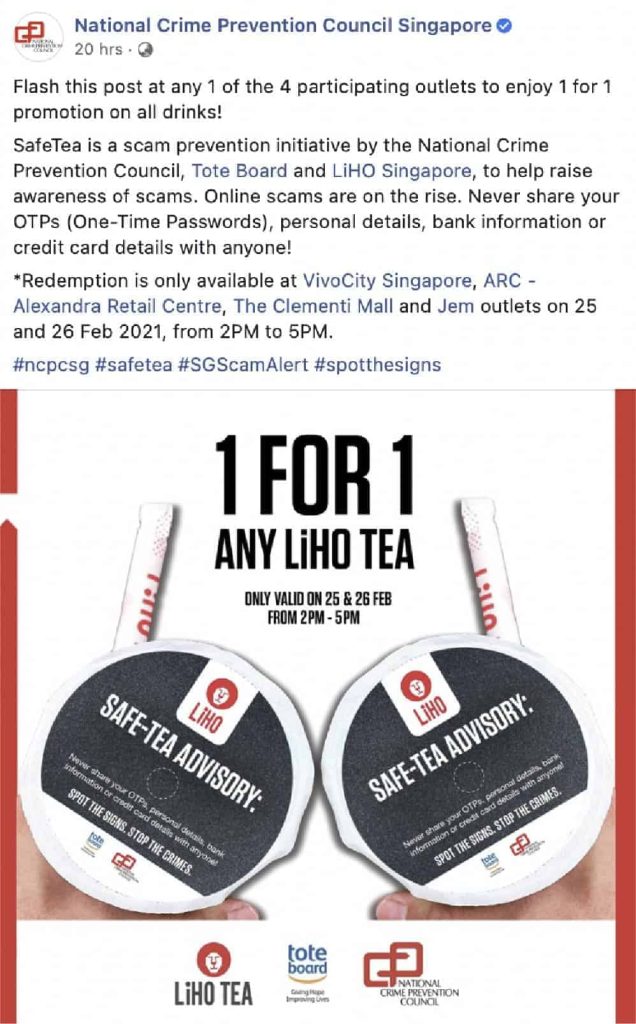 Safetea is a campaign headed by the National Crime Prevention Centre, Toteboard and LiHO TEA. As online scam cases continue to rise in Singapore, it is of utmost importance that everyone continues to stay alert.