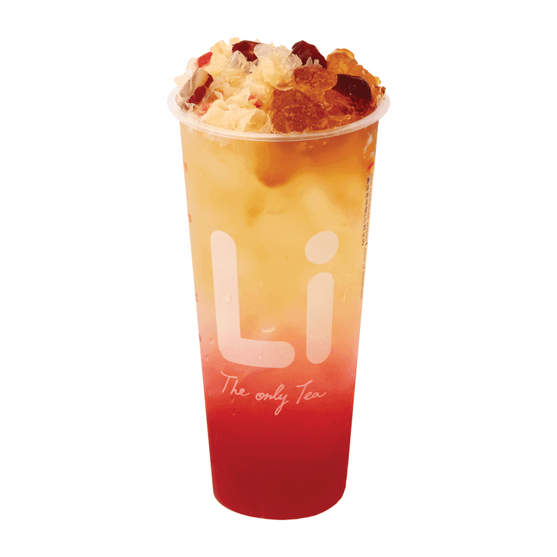 The ice-blended drink is layered with four exciting toppings. Firstly, delicate and chewy LiHO TEA pearls are added to create a base. A premium Da Hong Pao tea fills the body, and fluffy whipped cream is added.
