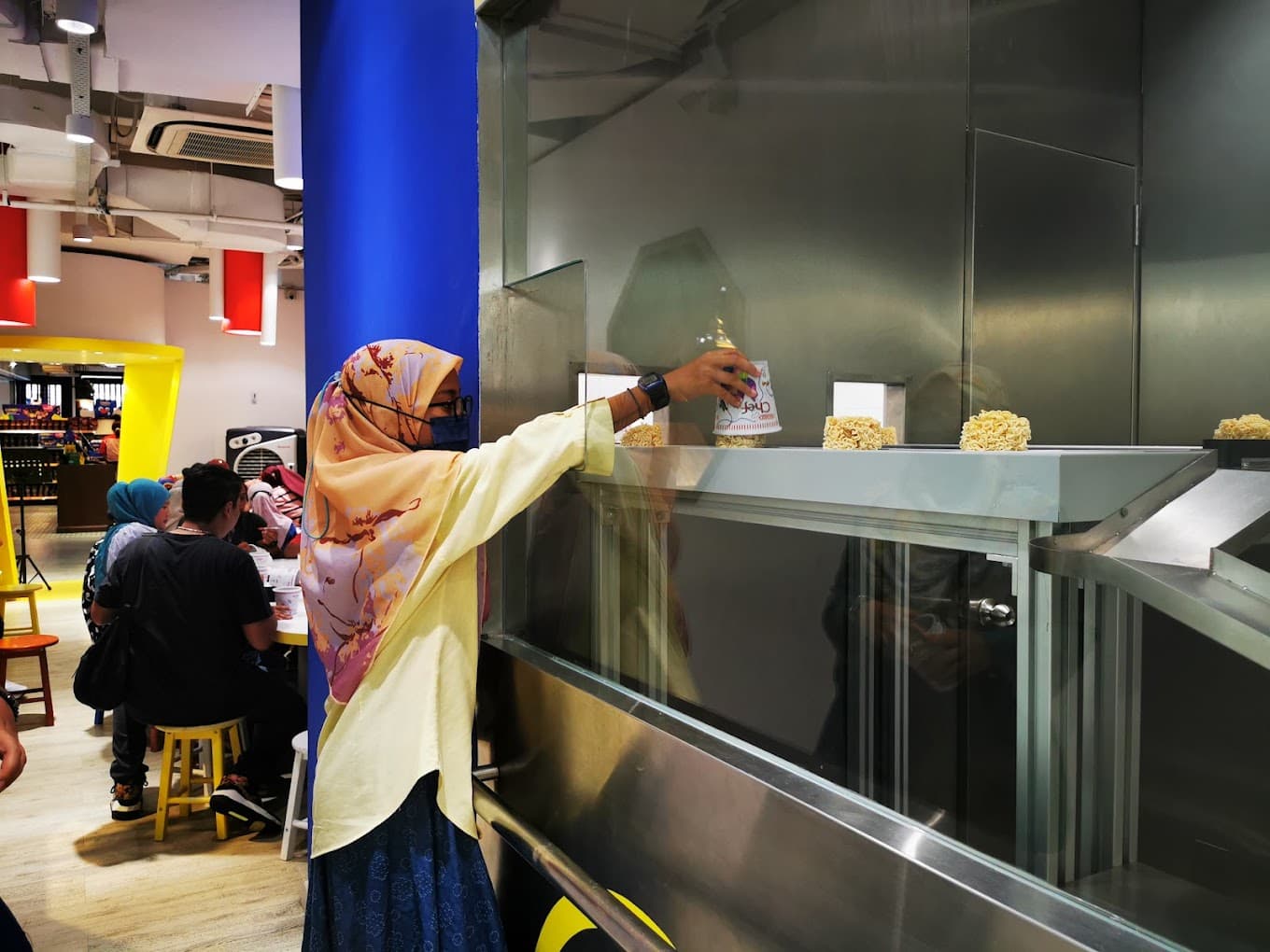 Unleash your inner creativity and doodle away on the noodle cups with the coloured markers provided. Once you’re satisfied with your masterpiece, place it on the conveyor belt and watch it get sent down the line to the condiments section.