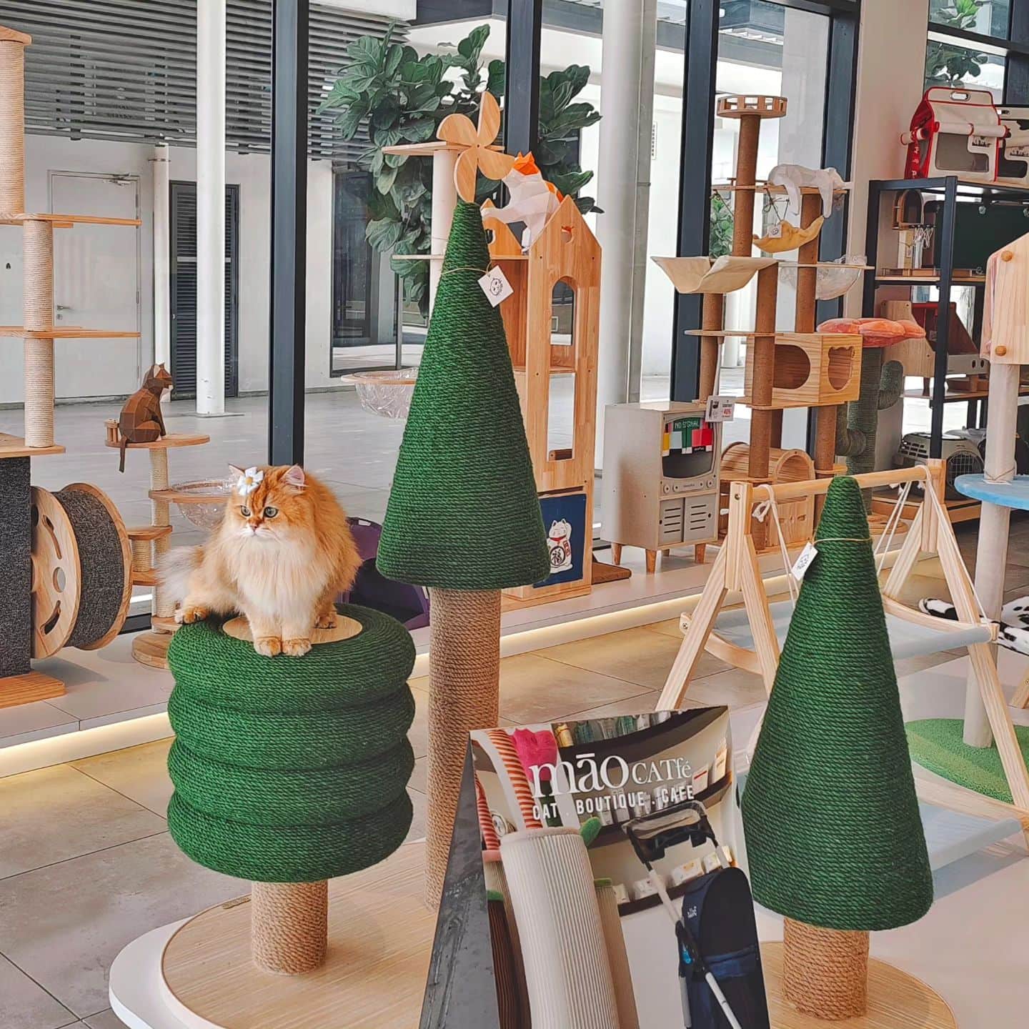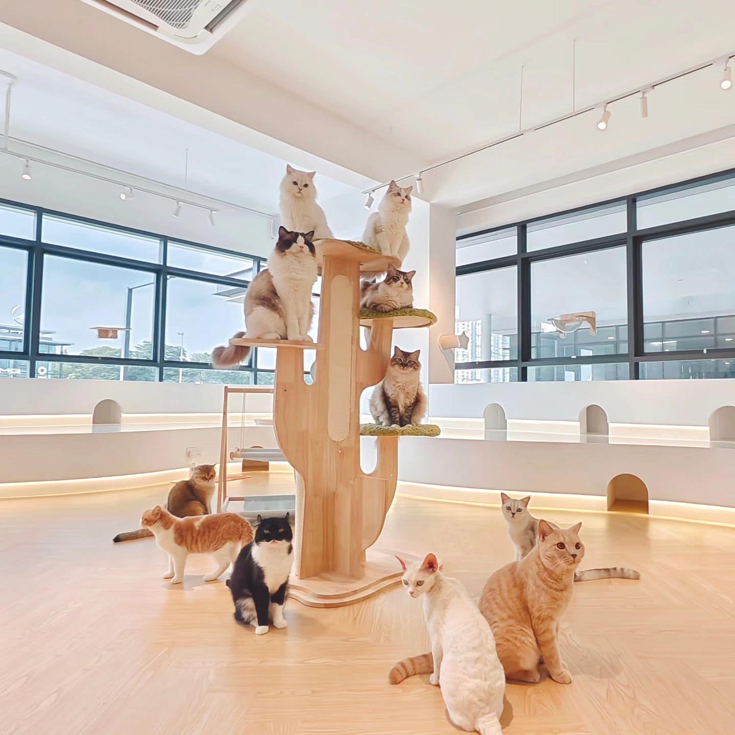 When the cats are not lounging around the room, you can find them climbing up the cute structures, perched atop scratch poles and cat trees, or resting in their little cubby holes. Of course, there’ll definitely be one or two little mischievous ones that will sneak up on you and steal your food while you’re not looking — so adorable.