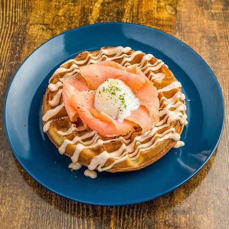 Mentaiko with salmon is one of the most natural flavour combinations out there, but what about adding some crispy waffles to the mix?