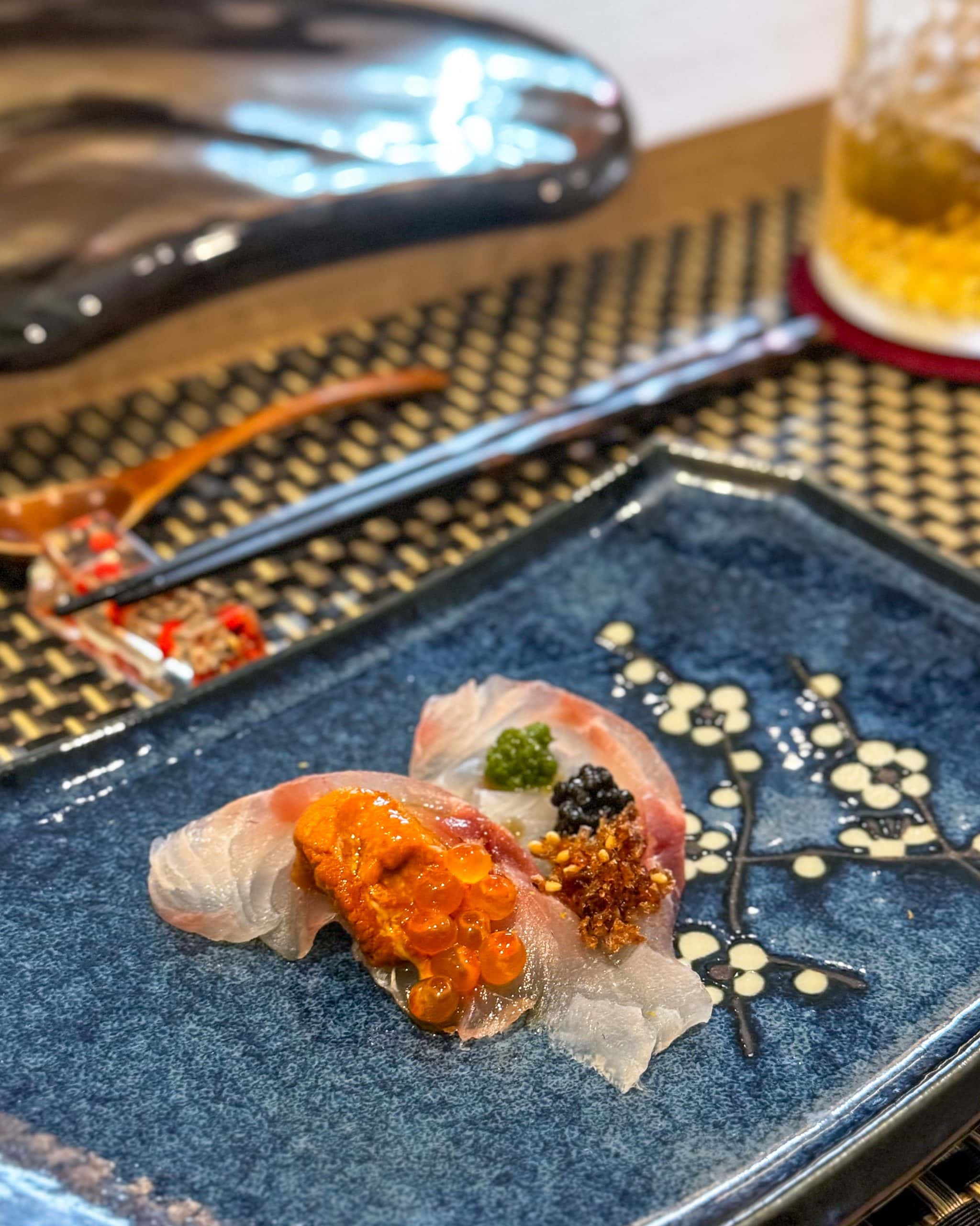 You’re likely to be served different varieties of seasonal fish you may have never tried, like our second course of chicken grunt, or isaki (yes, it’s a white fish that has nothing to do with chicken) with two topping combinations: uni and ikura; and caviar with incredibly umami smoked bonito.