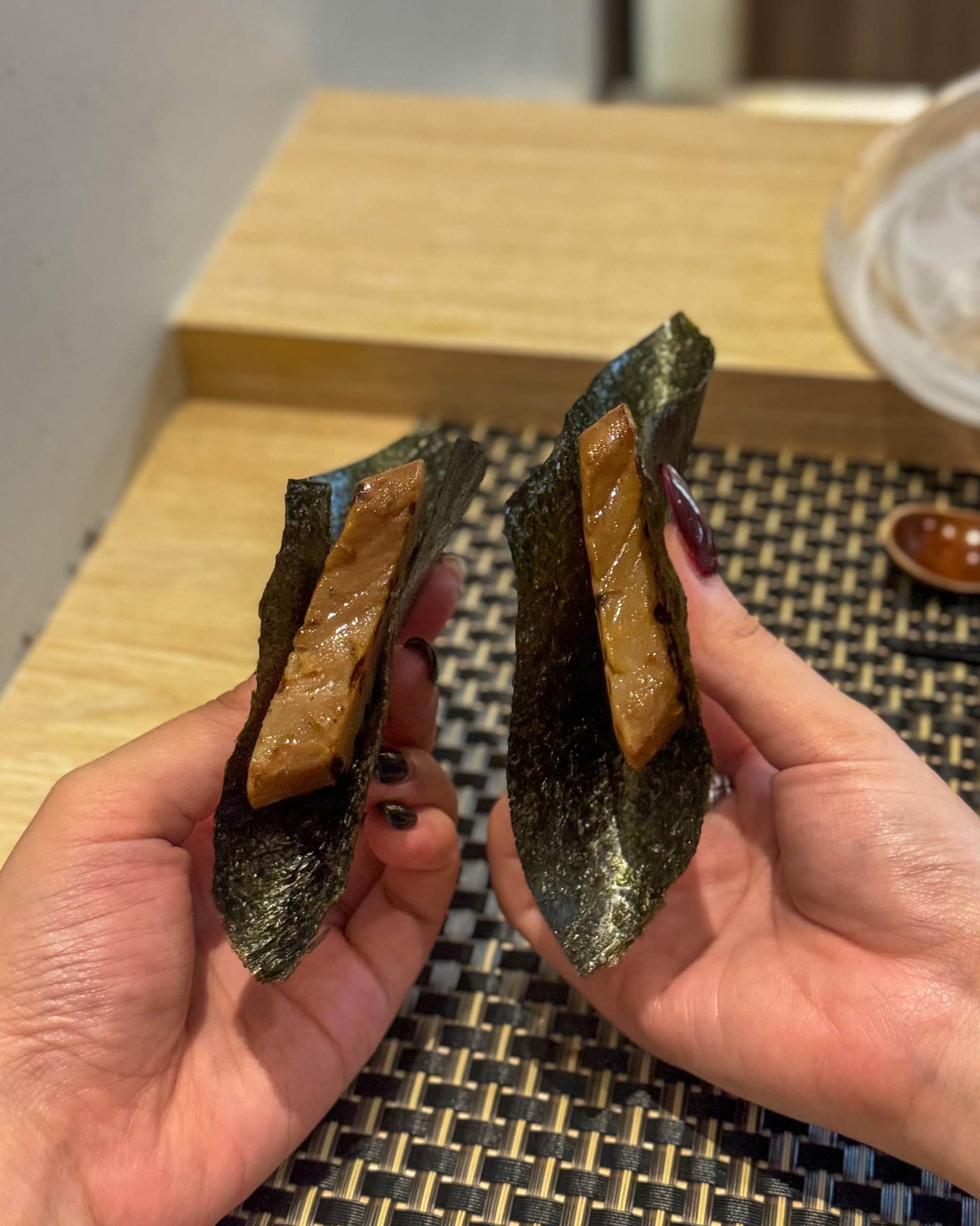 We then got to try soft and buttery white tuna wrapped in seaweed, which was directly handed to us, before being served the Steamed Dish — deep-fried Japanese yam with unagi.