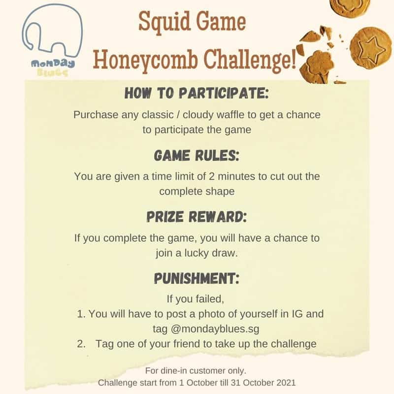 On top of that, Monday Blues is also inviting their diners to the iconic Squid Game Honeycomb Challenge where you’re given just two minutes to cut out the complete shape of the honeycomb. Successful players will then have a chance to join a lucky draw while players who fail will have to post a photo of themselves and tag Monday Blues’ handle.