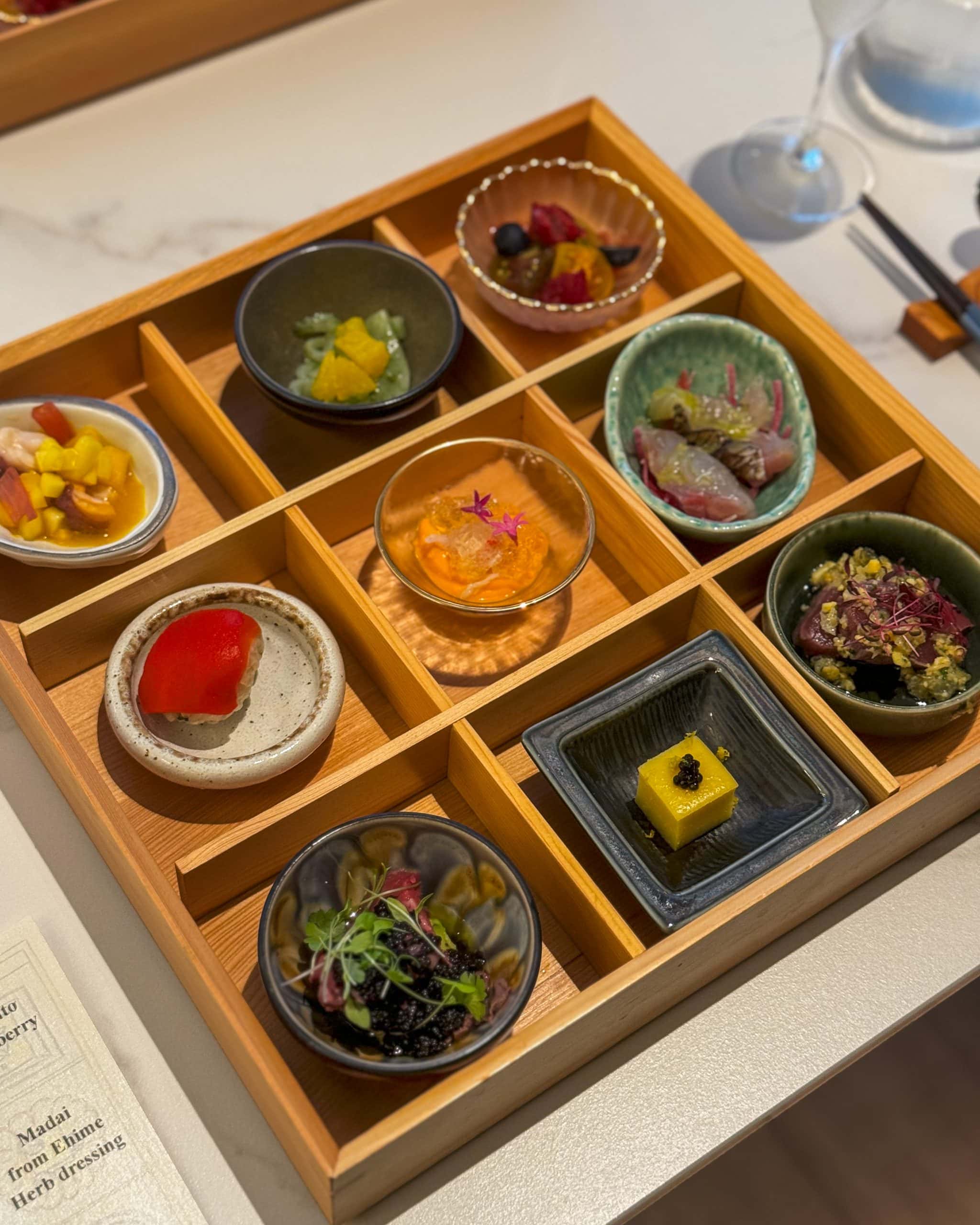 No two Shokado-9 boxes will ever be the same, hence the “omakase” aspect, but you can expect surprising flavour combinations like octopus, mango, and gochujang; carrot mousse and crab; and roasted wagyu, seaweed sauce, and avocado.