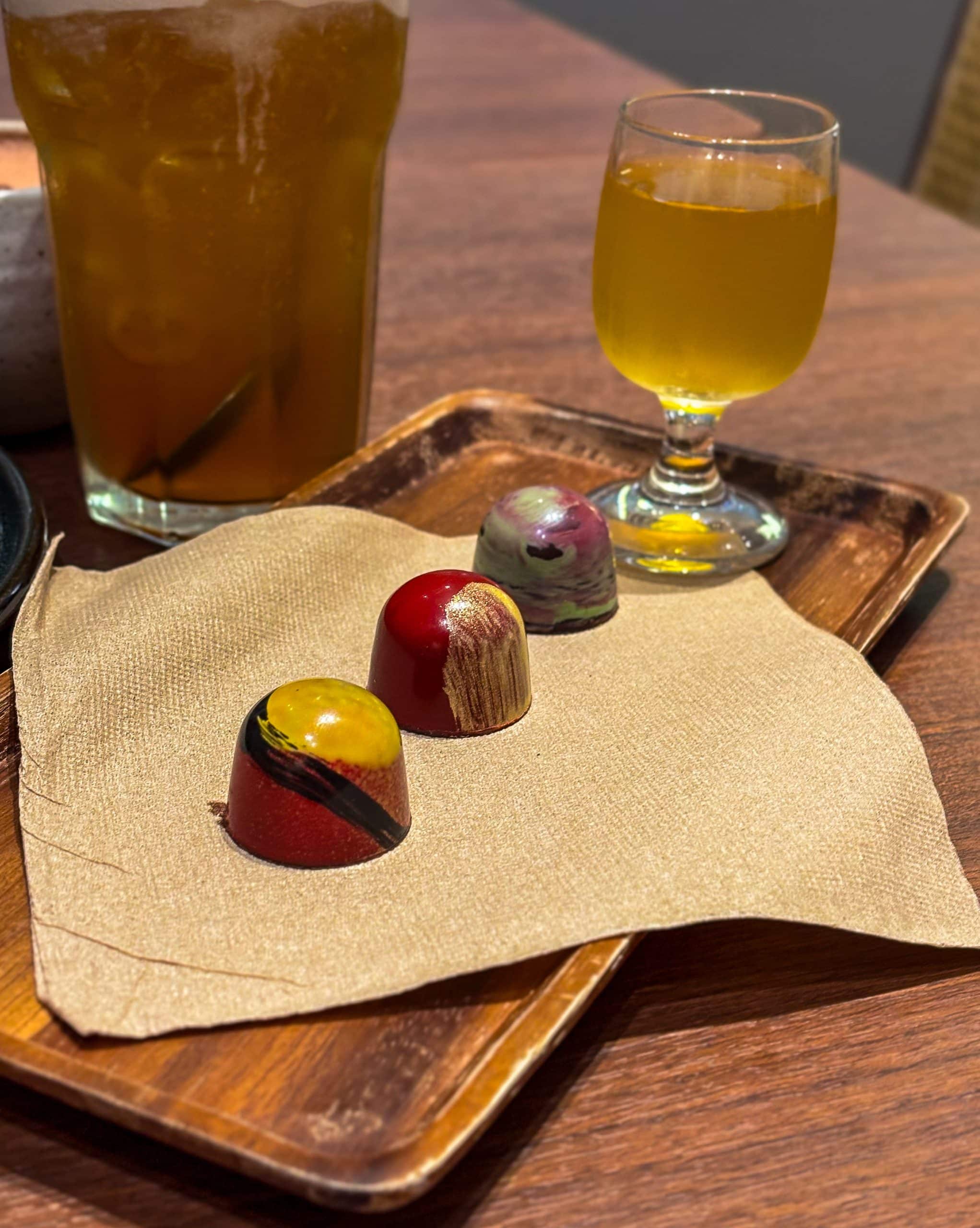 Make sure to wash down with the chrysanthemum tea provided between each bon bon to taste each flavour fully.