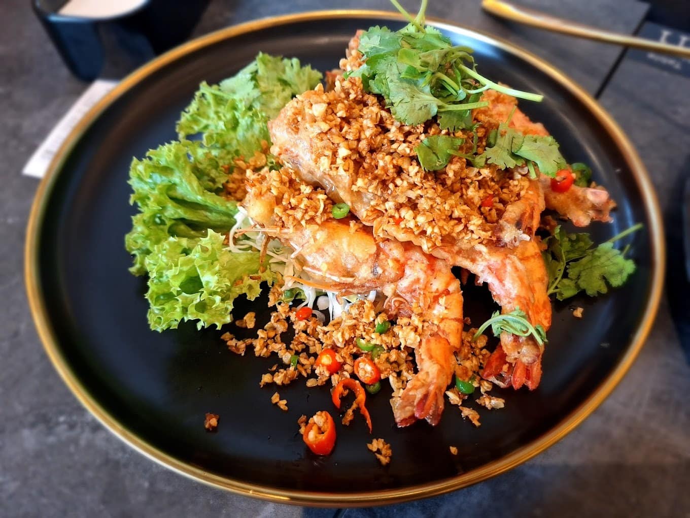 Seafood lovers, you’re in for a treat. The Kung Klua Prik Krea (S$22.90) is stacked with tiger prawns fried with chili, salt, and crispy garlic. Looks absolutely drool-worthy.