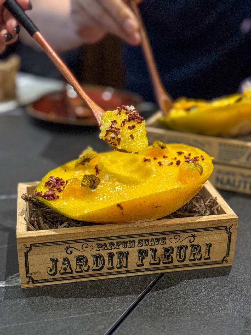 The former is a crowd favourite — a rich banana cake crowned with creamy vanilla ice cream, crispy banana skin, and a drizzle of caramel sauce. Meanwhile, the latter features a refreshing mango sorbet with fresh finger lime, topped with edible flowers and popping candy, all served in a real mango.