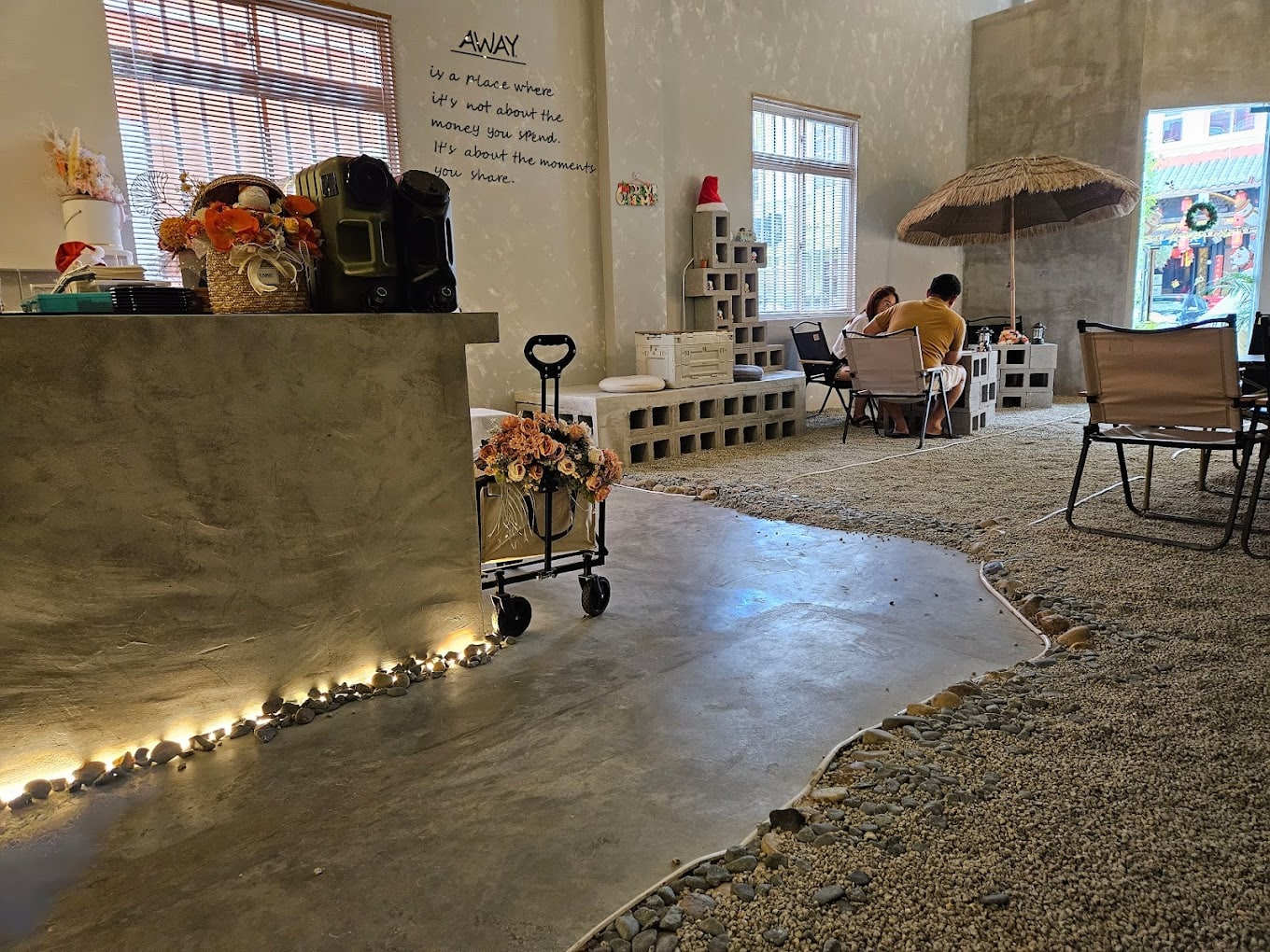 The gravel stone flooring immediately grabbed my attention as it’s something you don’t typically see in cafes. Alongside the camping chairs and table made up of cinder blocks, it really makes the ‘camping’ experience a lot more realistic.