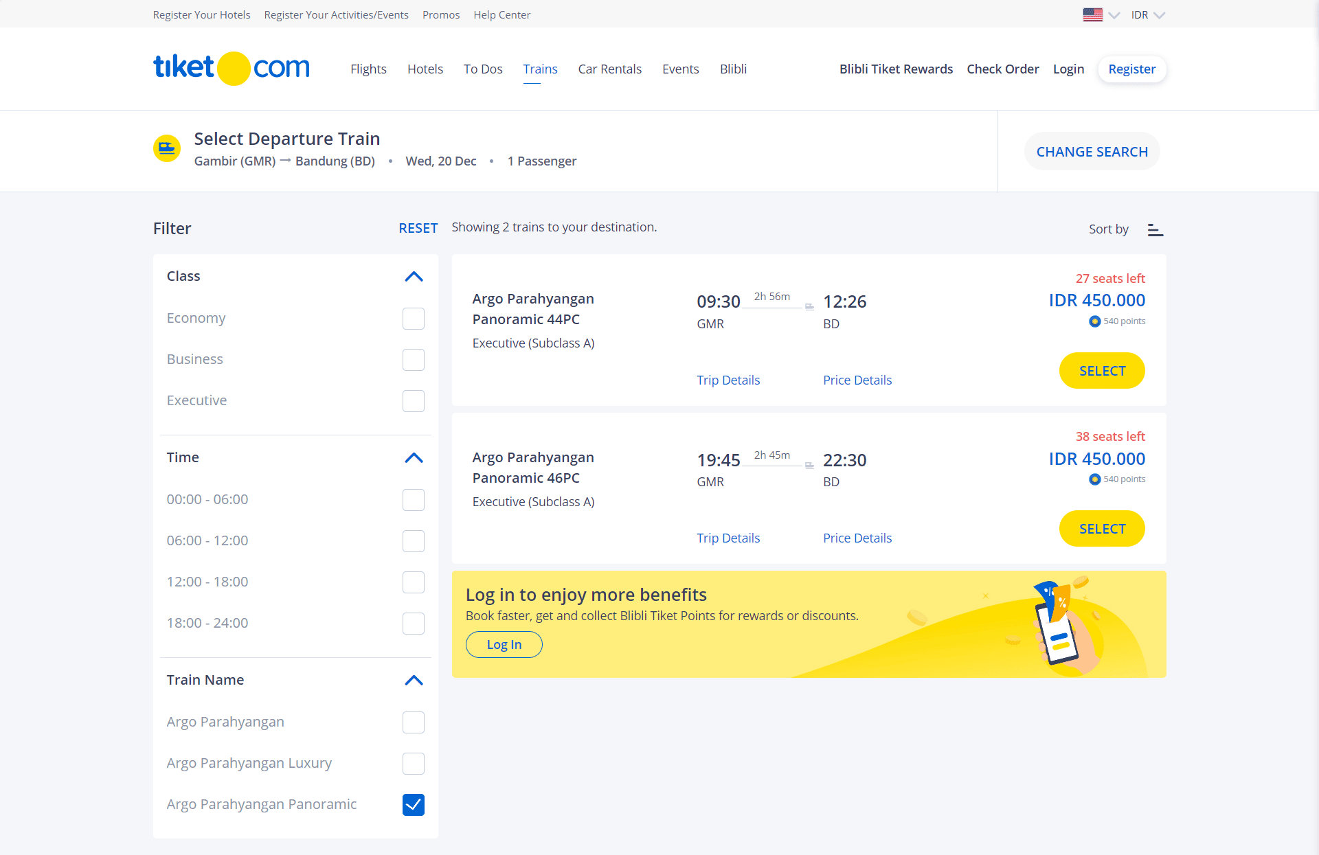 An important thing to note is that Panoramic-class tickets usually do not show up immediately. Make use of the “Train Name” filter and select “Argo Parahyangan Panoramic” for an easier booking process.