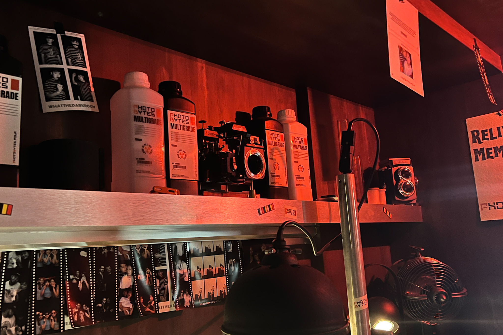 Photobytes’ unique darkroom photobooth certainly looks the part, given that it features decor and pieces of equipment those who’ve been in an actual darkroom may recognise, like vintage film cameras, bottles of “development” chemicals, a glowing red safelight, and even an enlarger (also called a projection printer).
