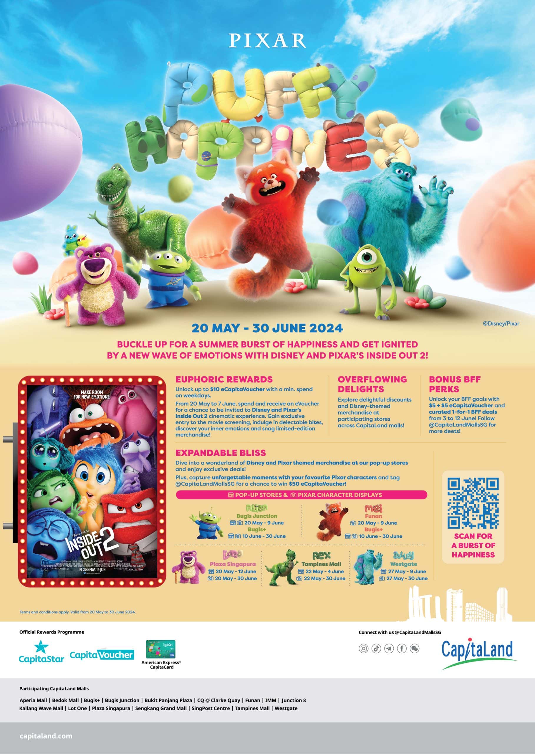 The Disney and Pixar Puffy Happiness pop-up will be taking place from now till 30 June 2024 at five malls across Singapore — Plaza Singapura, Bugis Junction, Bugis+, Tampines Mall and Westgate.