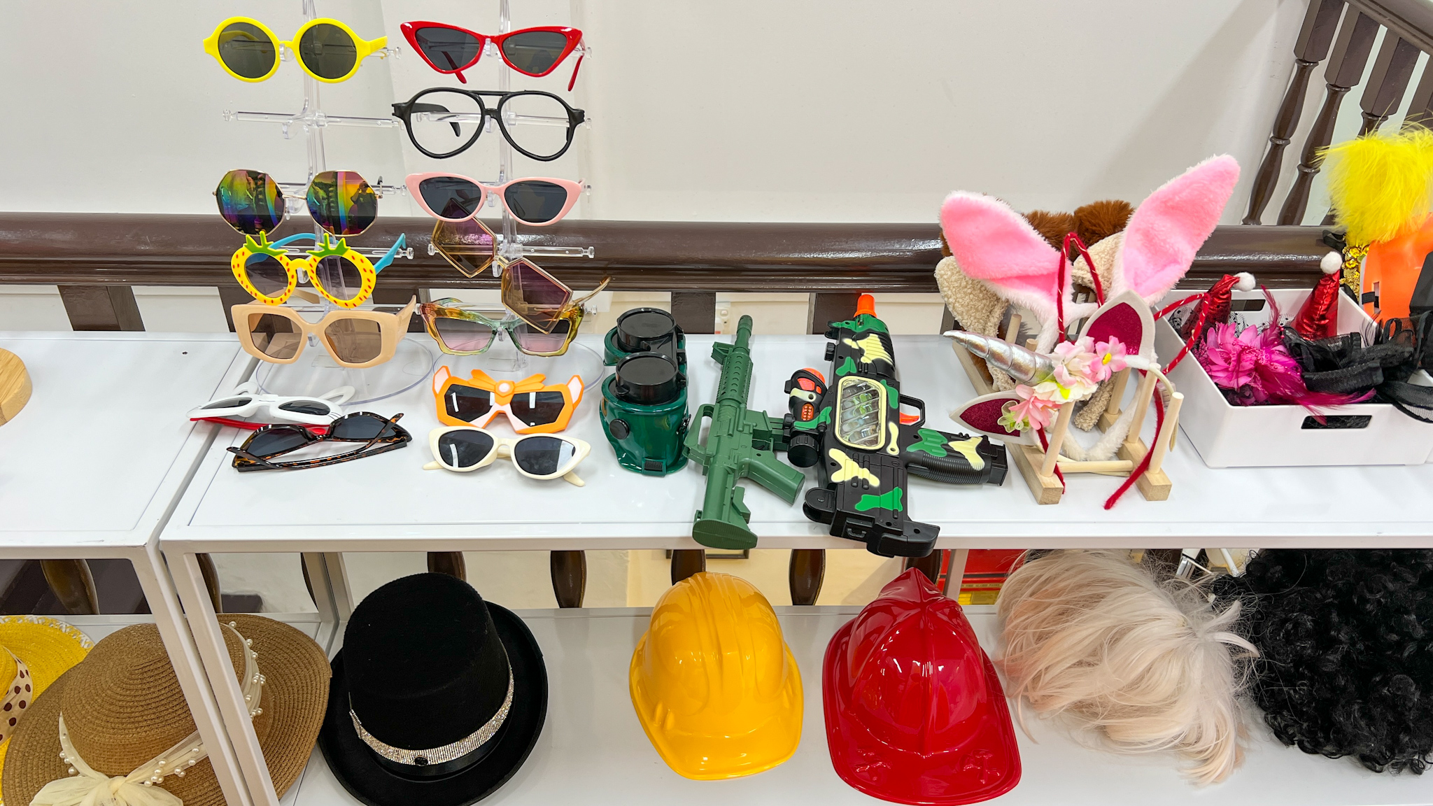 How does it all work then? First, take your pick of props from the shelves. There’ll be a fun assortment of toy guns, glasses, wigs and more to choose from.