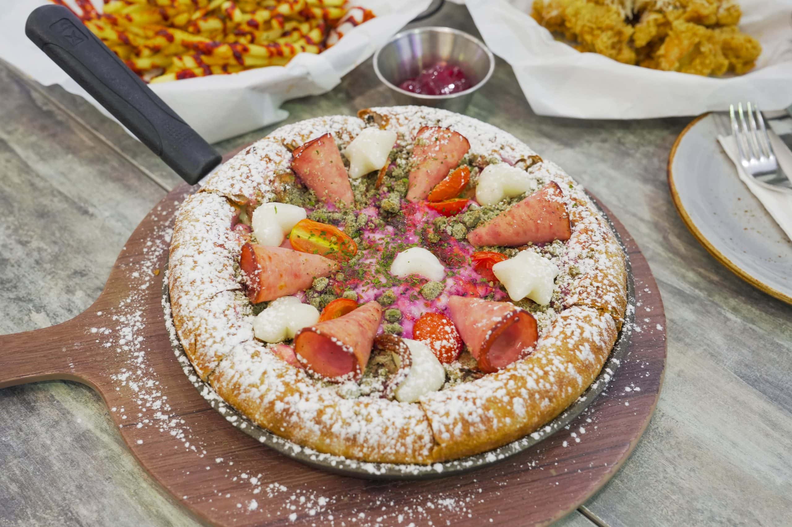 It comprises chicken pepperoni, honey chicken ham, Korean rice cake, cookie crumble, dusted with icing sugar and served with strawberry jam on the side.