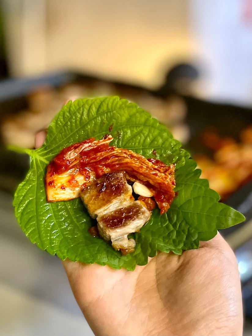 Pair your juicy grilled pork with side dishes, or banchan, like kimchi (we highly recommend throwing some onto the grill), dried anchovies, spicy fish cakes, raw onions, and perilla leaves for wrapping.
