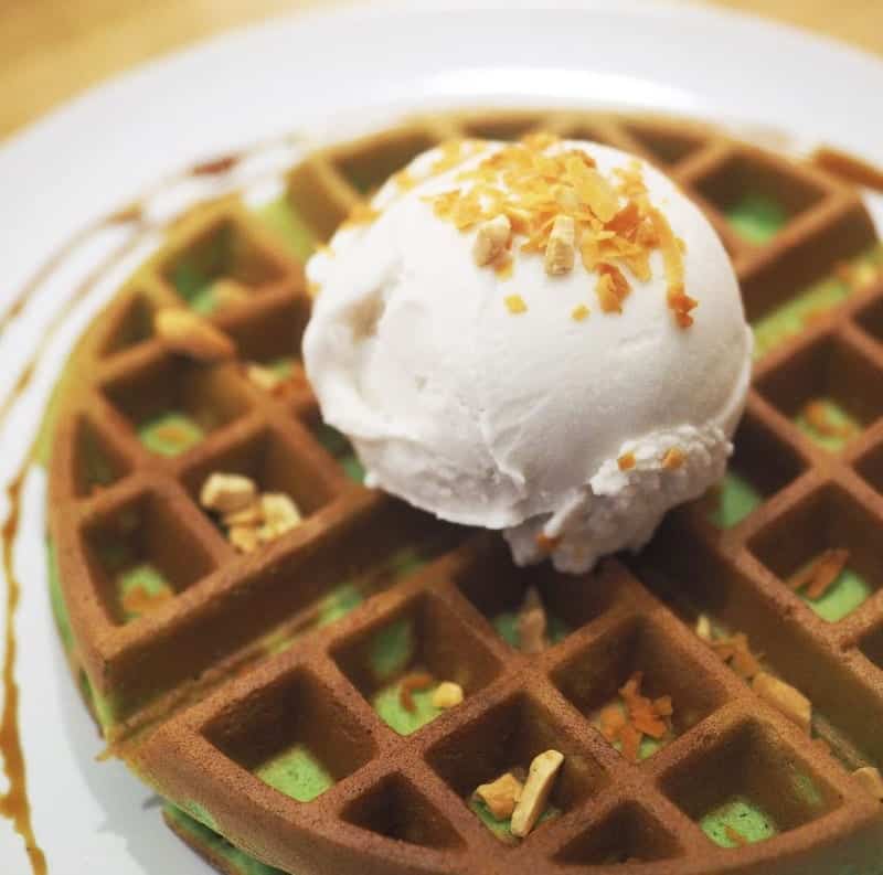 However, if you want a waffle with a twist, go for their Coco Pandan (S$10). A special combo served with coconut sorbet, coconut pandan waffle, and a side of gula melaka sauce.