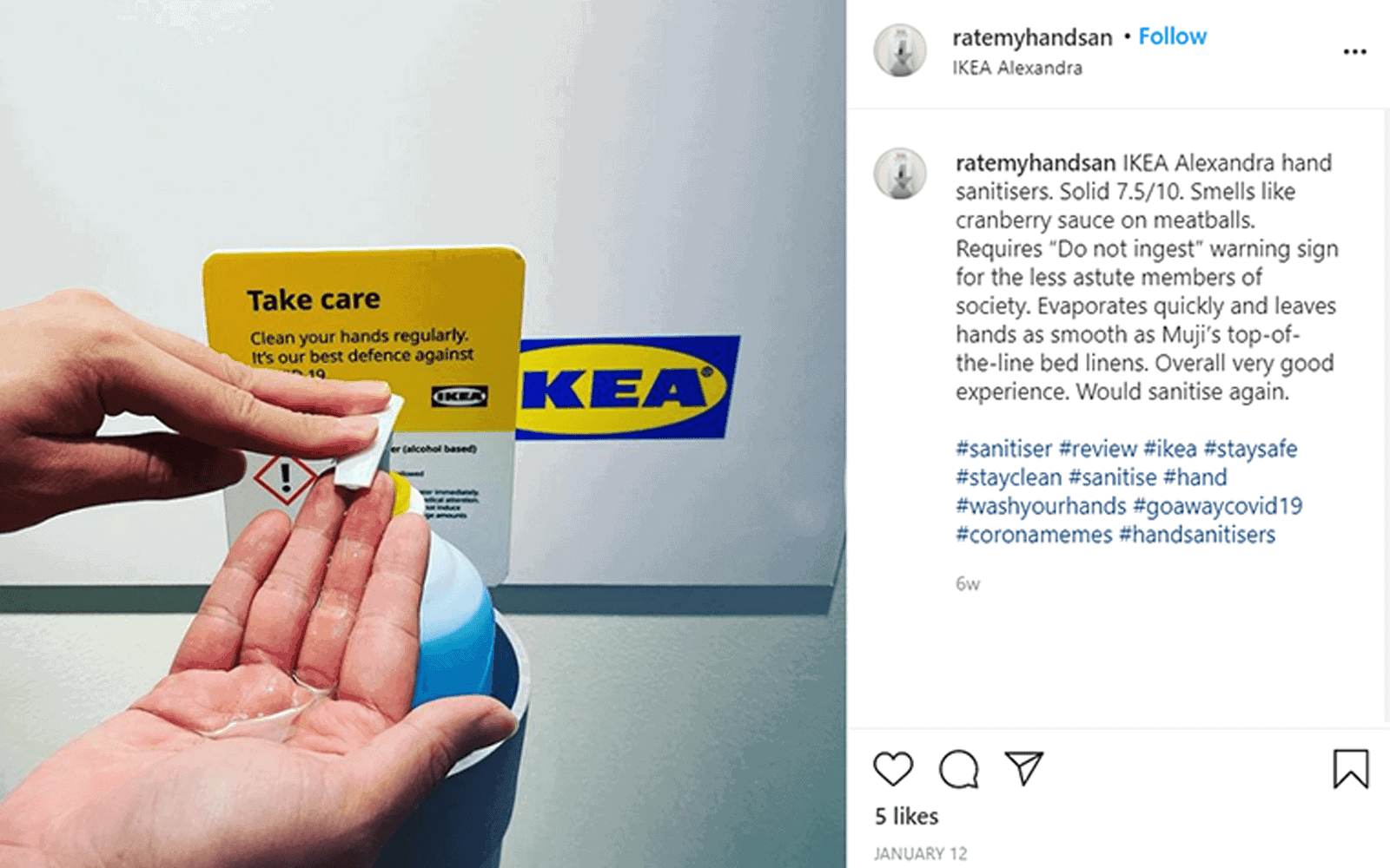 @ratemyhandsan’s first post features IKEA’s hand sanitiser. As stated, it was rated a solid 7.5/10 and “leaves hands as smooth as Muji’s top-of-the-line bed linens”. Here’s another reason to visit IKEA again, if their meatballs aren’t enough.
