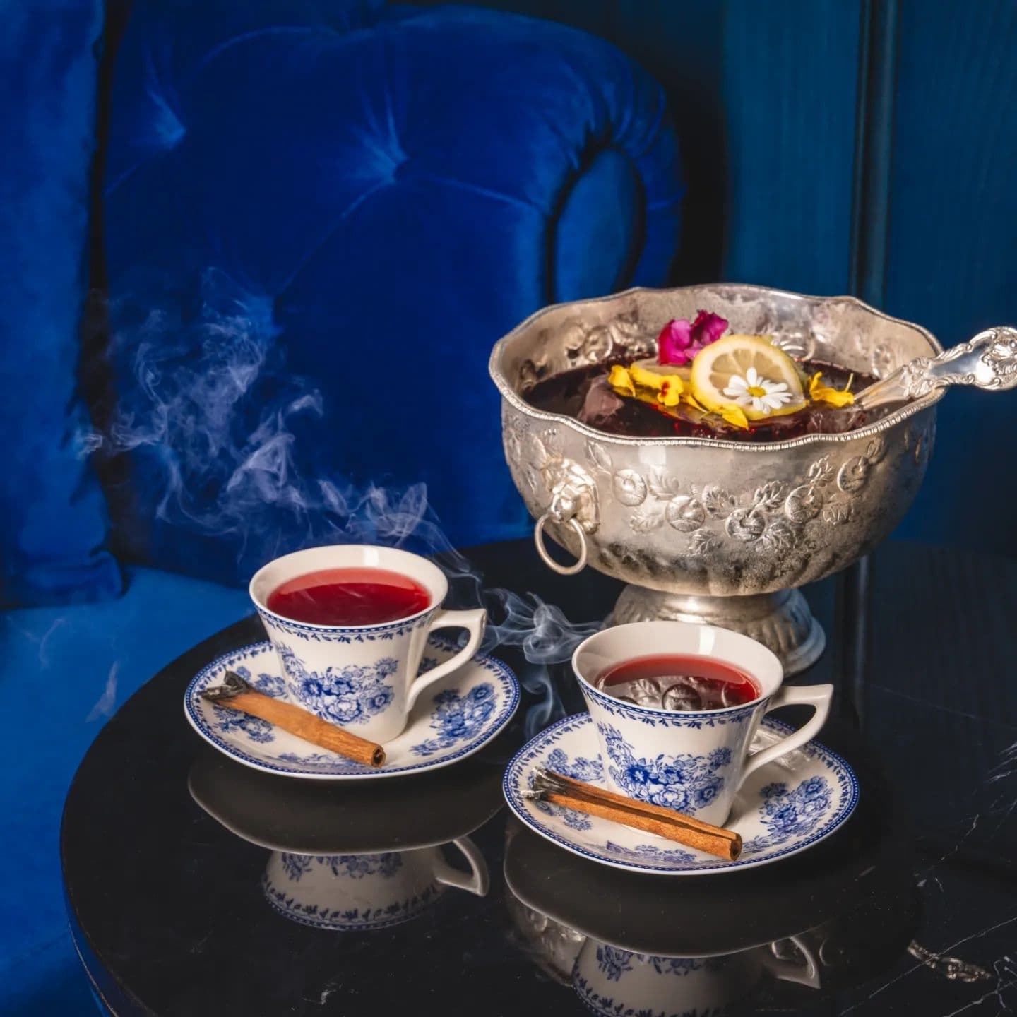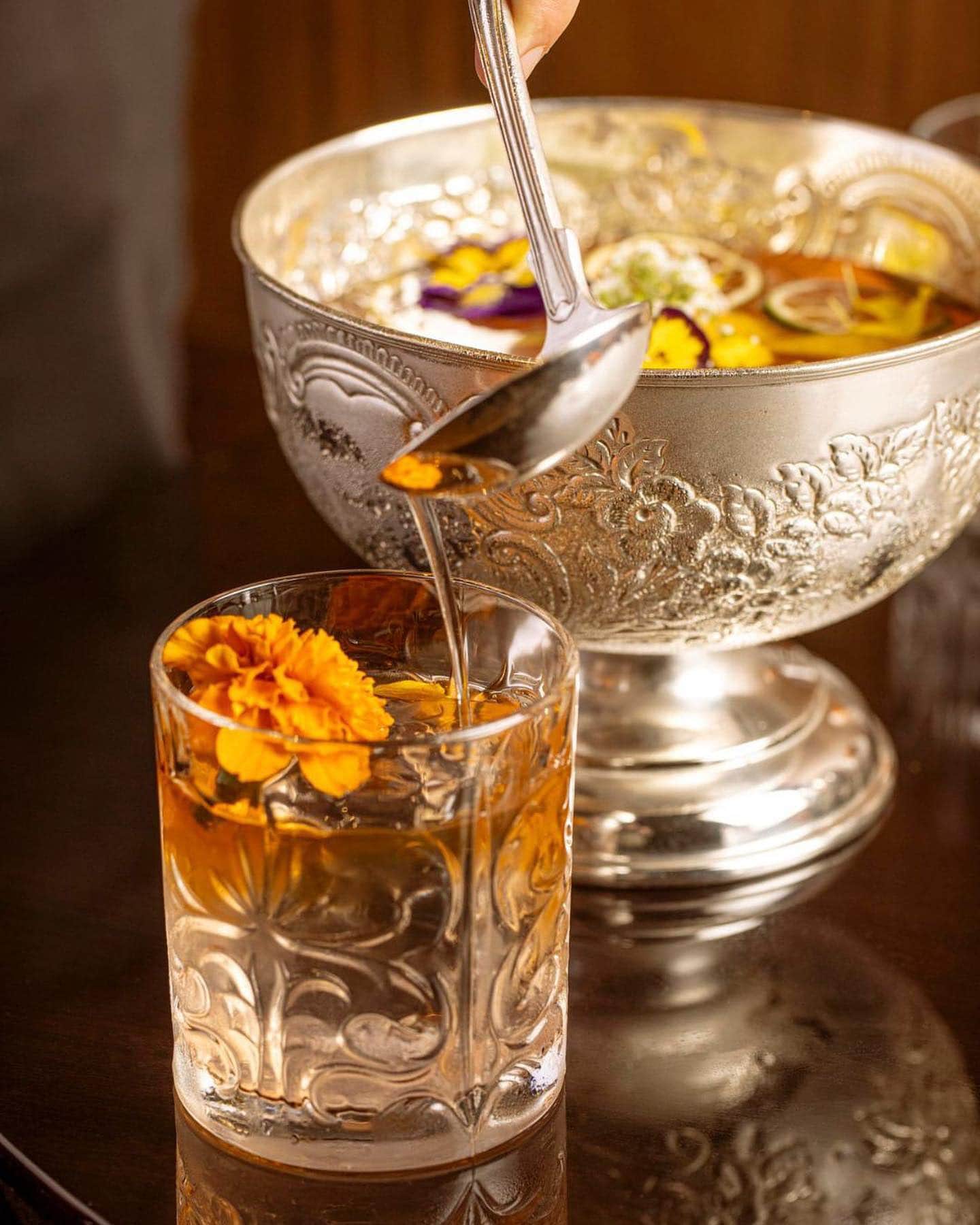 You can sip on punch in individual servings or communal antique punch bowls — complete with a matching ladle — to share with friends.