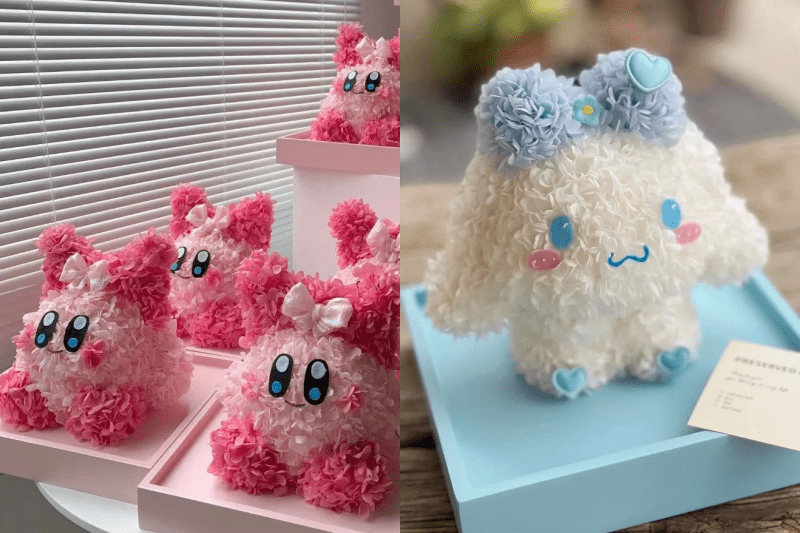Besides plush toy bouquets, the studio also sells character-themed preserved flowers. From afar, these look like they could also be fluffy plush toys… But take a closer look and you’ll see that they’re actually made of hundreds of preserved flowers intricately put together to form adorable characters.