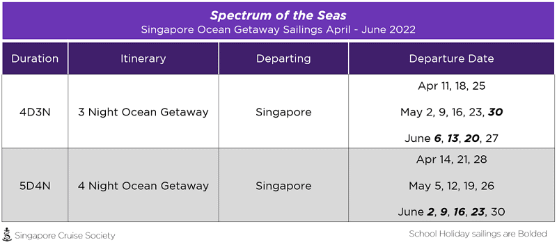 The Spectrum of the Seas will continue operating 3- and 4-Night Ocean Getaway sailings that depart on Mondays and Thursdays from Marina Bay Cruise Centre. Twenty-four new sailings will be available from 11 April to 30 June 2022. Be sure to plan ahead, especially if you intend to bring your kids for a cruise during the June school holidays.