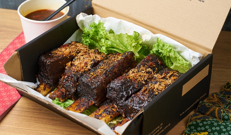 You can choose to tuck into these tender, juicy, and wickedly glazed ribs in a set with Rice (S$36.90) or Indo Mee (S$38.90), alongside fried tofu, Karedok Set (Indo Salad), and a choice of sambal.