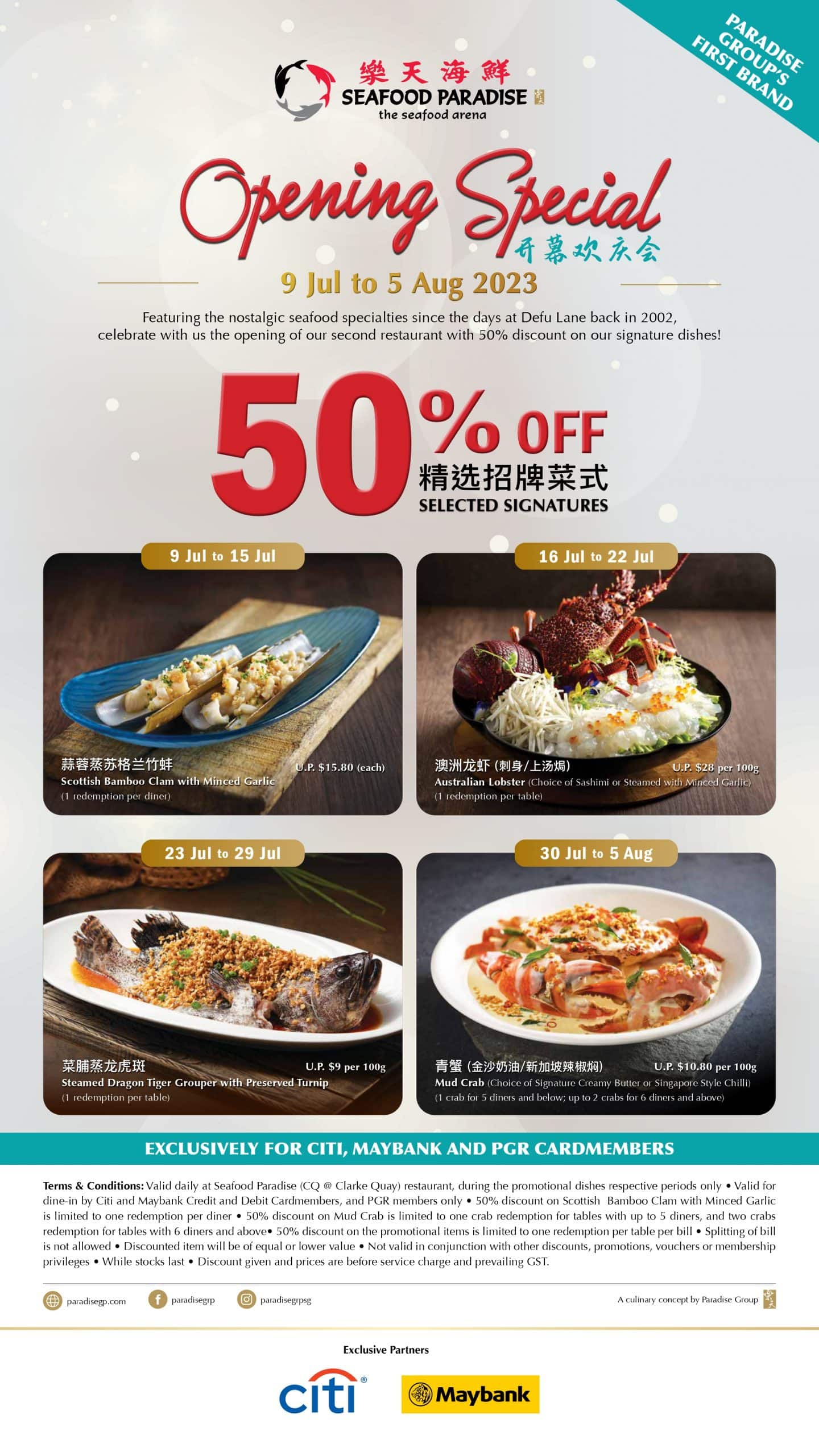 In celebration of its opening, Seafood Paradise Clarke Quay is holding a month-long promotion with 50% off Signature Seafood Classics for Citi and Maybank cardholders, and Paradise Group members.