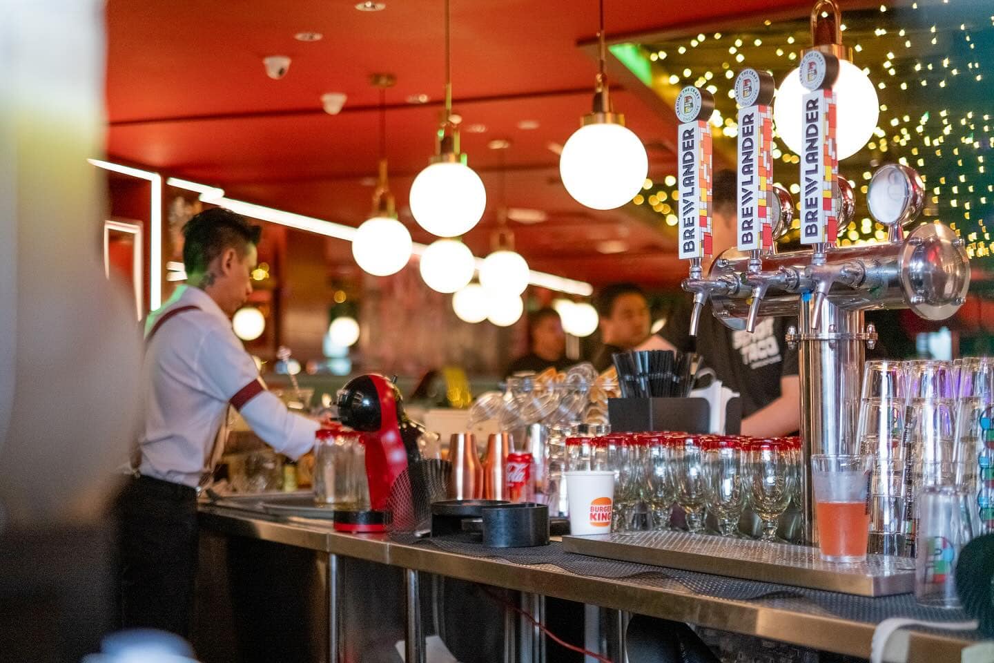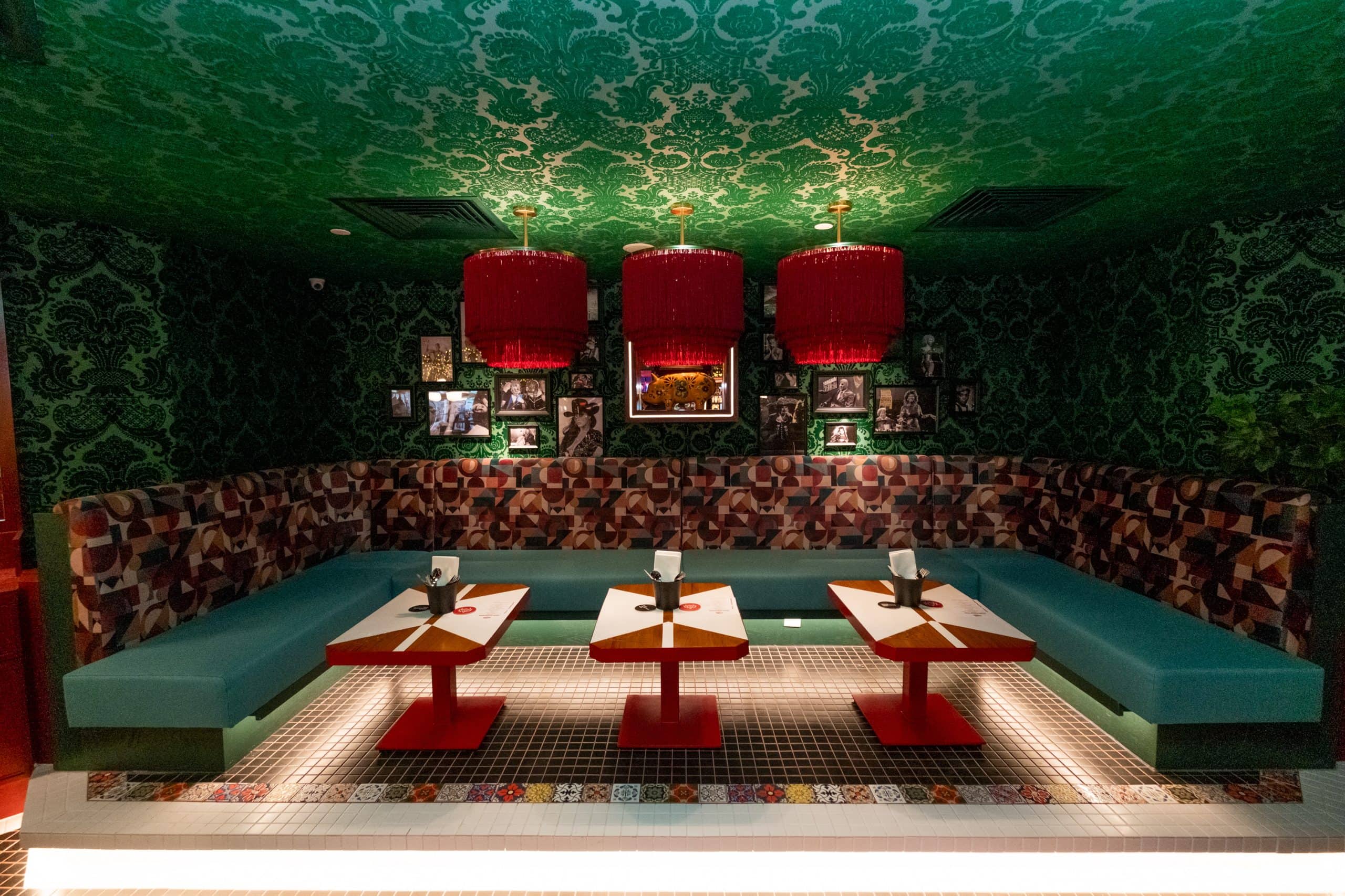 Otherwise, head indoors towards the booth seating tucked away in a corner — adorned with green tapestry and red fringe pendant lights — for a cosy ambience.